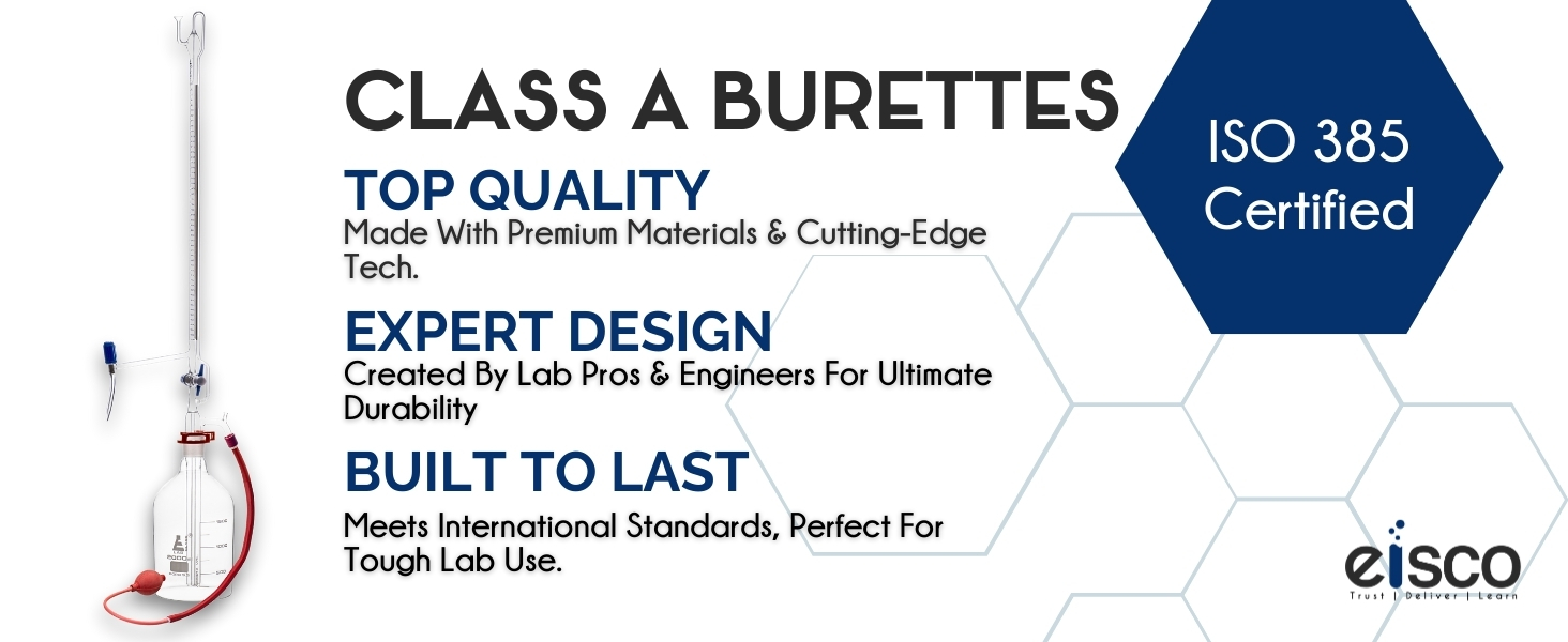 CLASS A || Class A with 34/35 joint size, 0.05±ml tolerance and 0.10ml sub. divisions - Accurate as per ISO 385