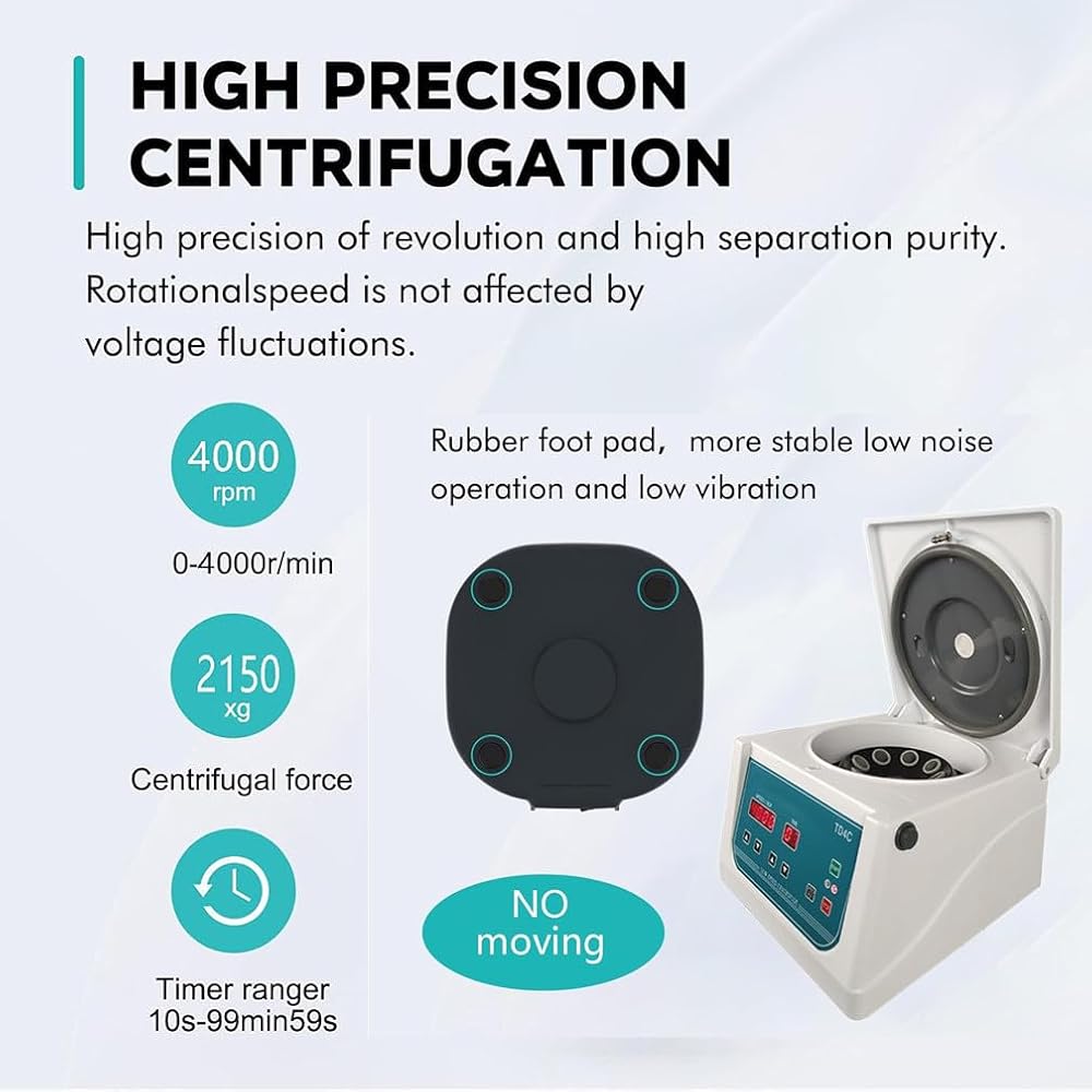 Introducing our Low-Speed Centrifuge, engineered to operate seamlessly between 0-4000 RPM, ensuring minimal sample damage and loss during critical procedures. This compact unit is designed for quiet operation, making it the perfect choice for daily tasks in life sciences, beauty institutes, medical facilities, food processing, and biochemical laboratories. **Key Features:** 1. **Reliable Brushless Motor:** Experience consistent performance and longevity with our advanced brushless motor, tailored for demanding environments. 2. **Low Noise Operation:** Enjoy a quieter workspace with noise levels maintained at ≤55 dB, allowing for focused work without distractions. 3. **User-Friendly Design:** The innovative design includes a flipped shell, integrated viewing window, and convenient lighting hole, enhancing usability and safety. 4. **Safety Lock Mechanism:** The secure cover lock prevents accidental opening, ensuring peace of mind during operation. 5. **Versatile Applications:** This centrifuge is suitable for a variety of applications, accommodating a wide range of sample types. **Specifications:** - **Type:** Low-Speed Centrifuge - **Motor:** DC Brushless 60W - **Max Speed:** 4000 RPM - **Centrifugal Force:** 2150×g - **Rotor Capacity:** Holds 8 x 10/15ml centrifuge tubes - **Power Supply:** Universal 110V - 240V - **Speed Accuracy:** ±20 RPM - **Timer Range:** 0 - 99 minutes - **Motor Type:** Brushless DC motor - **Dimensions:** 30 x 27.1 x 19 cm - **Weight:** Approximately 8 kg **Package Includes:** - 1 x Centrifuge Enhance your laboratory efficiency and achieve reliable results with our Low-Speed Centrifuge, designed to meet the needs of professionals across various fields.
