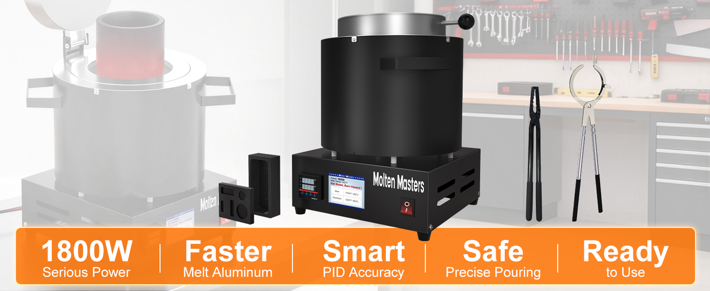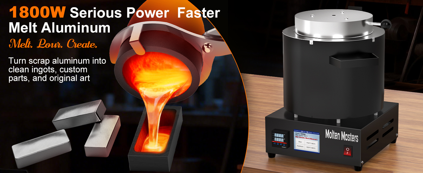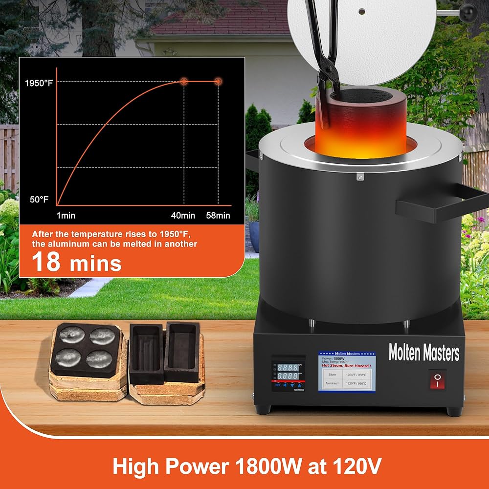 1950℉ / 1066℃ MAX TEMPERATURE: Maximum temperature reaches 1950℉ / 1066℃, suitable for melting aluminum, tin, lead, and other low-melting metals below 1000℃. Powered by 1800W high output, melts aluminum in 50–60 minutes at 60% crucible fill