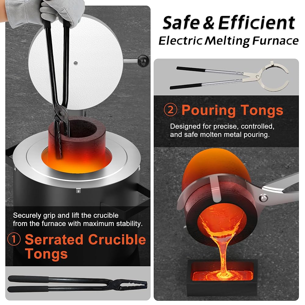 DUAL SAFETY TONGS INCLUDED: Includes 2 specially designed heavy-duty tongs for safer handling and pouring. Wolf Jaw Tongs securely grip and lift hot crucibles, while the 7KG pouring tongs allow controlled and safe molten metal pouring