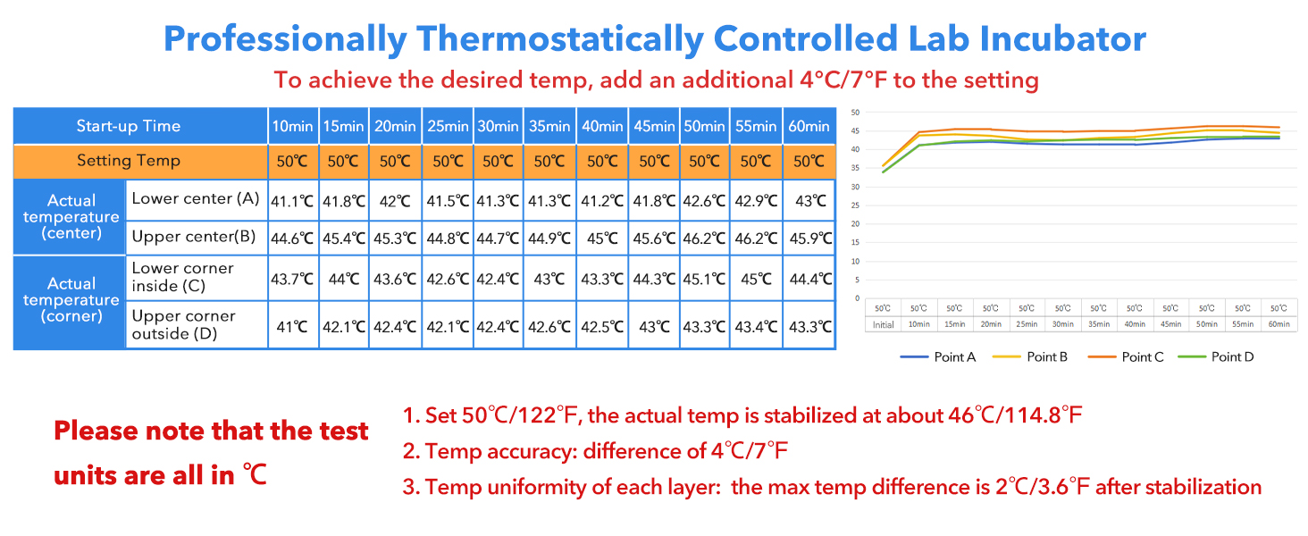 Long press "↑" "↓" at the same time, the temp unit is converted to ℉. Hot air circulation system ensures uniform temp distribution throughout the incubator, with a maximum heating capacity of 65°C (148°F). Please note that when setting the temp, you need to add 4℃ (7°F) more on the target temp, for example: target 30℃ (86°F), need to set 34℃ (93°F)