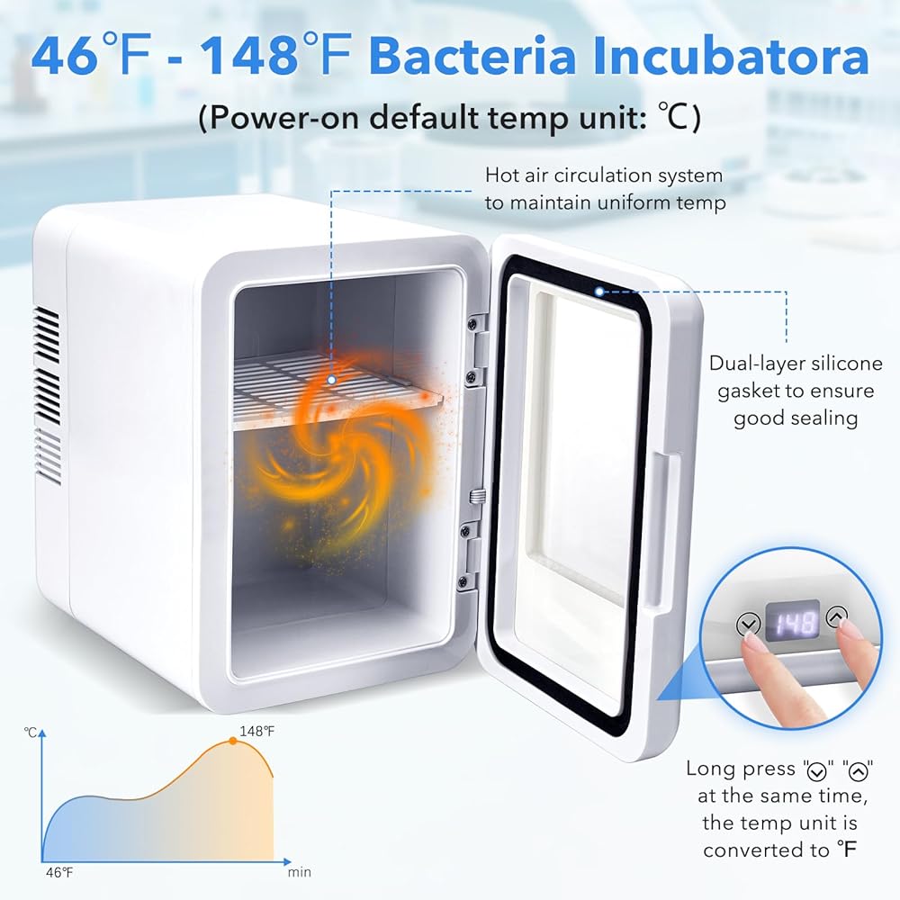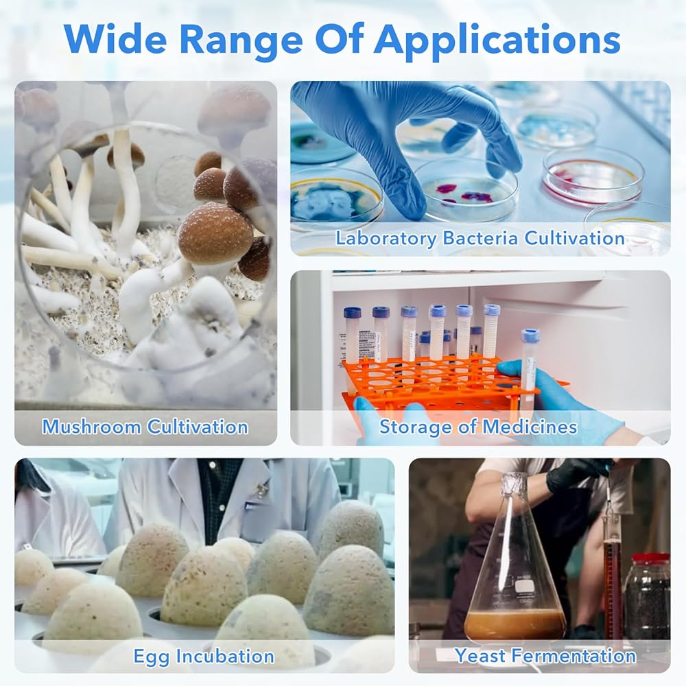 Includes a 110V standard power cord for laboratory, school use, with a 12V adapter during the trip. Ideal for scientific research, agricultural studies, and bacterial cultivation in institutional laboratories. Also can be used for egg incubation, mushroom hatching, yeast fermentation, etc