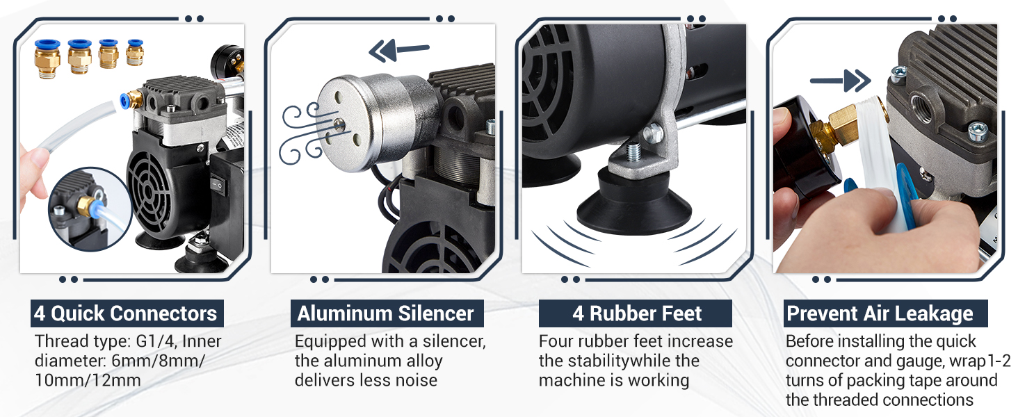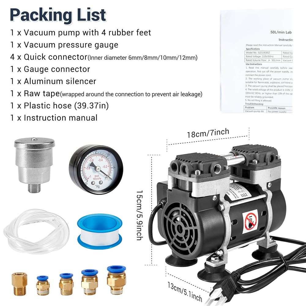Packing List: 1 x vacuum pump with 4 rubber feet, 1 x vacuum pressure gauge, 4 x quick connector: Inner diameter 6mm/8mm/10mm/12mm, 1 x gauge connector, 1 x aluminum silencer, 1 x PTFE tape (wrapped around the connection to prevent air leakage), 1 x plastic tube (39.37in), 1 x instruction manual