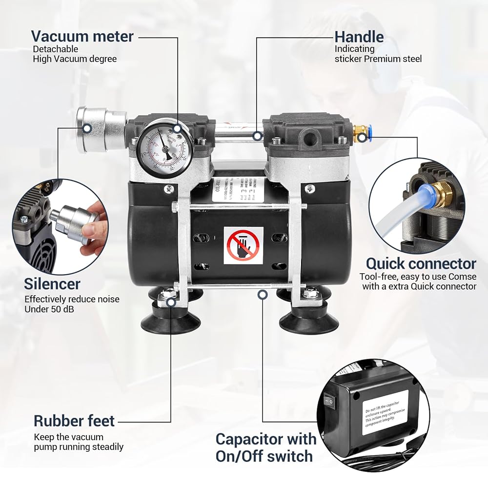 Silence Vacuum Pump: Aluminum alloy silencer reduces the noise generated during use to a greater extent, providing you with a quieter working environment. Your ears (and your neighbors) will thank you