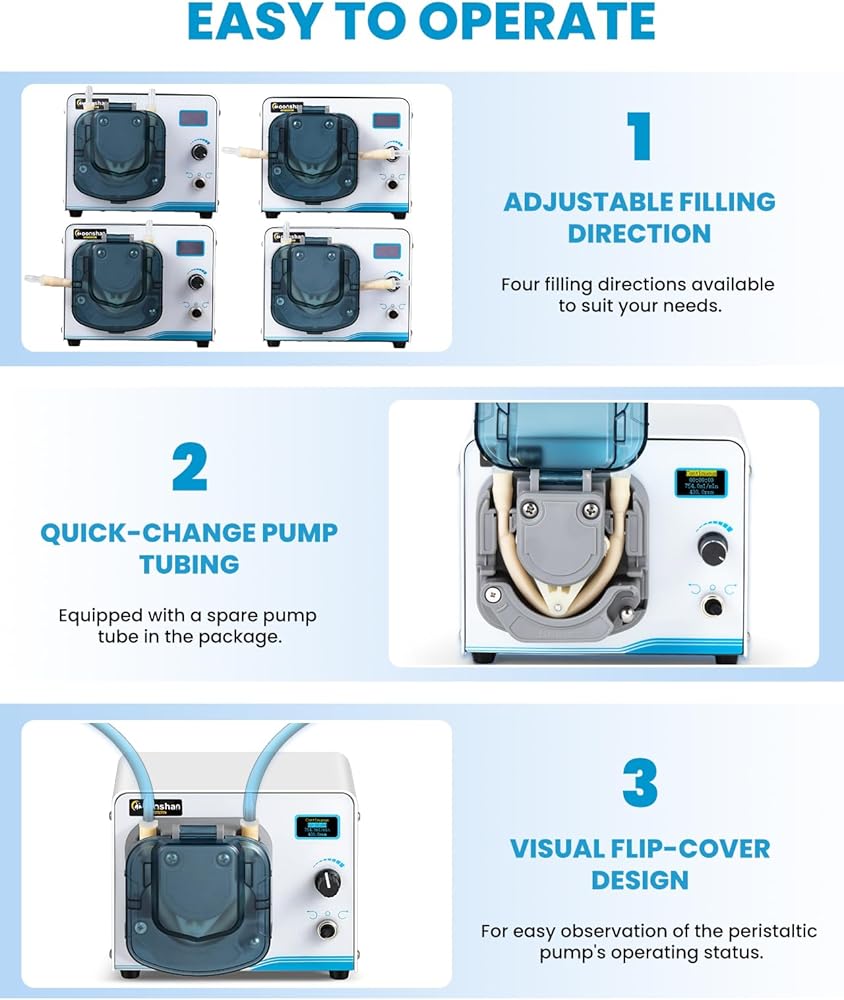 Versatile Functions with User-Friendly OLED Control: An intuitive OLED display allows for easy parameter setting and operation. It supports both aspiration and dispensing functions with multiple modes: continuous, timed, and precise volume-based dispensing. Additional features include start/stop, reversal, speed adjustment, calibration, reverse suction, and power-off memory.