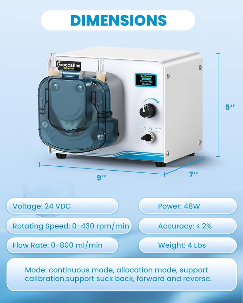 High Precision Stepper Motor: Driven by a high-precision, long-life stepper motor, this pump delivers exceptional accuracy and repeatability. The digital OLED display provides real-time result on speed and flow rate, while a high flow rate of up to 800 mL/min ensures efficient liquid transfer.