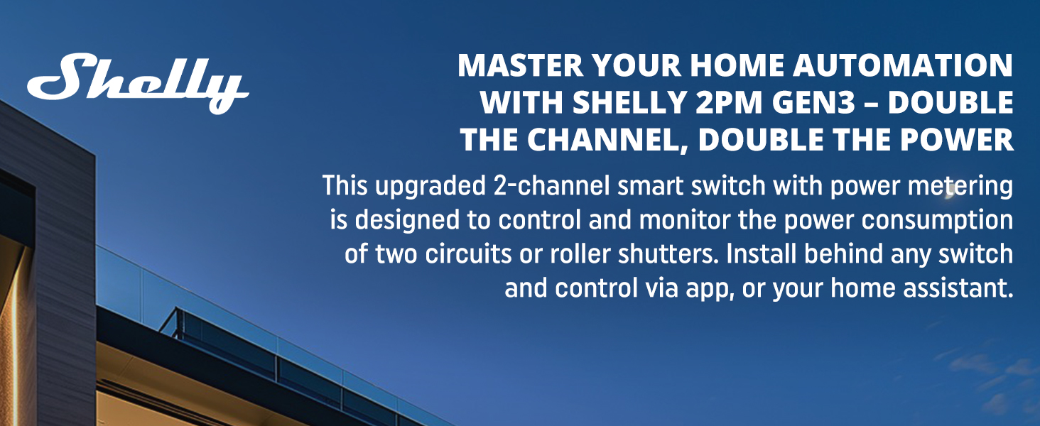 The Shelly 2PM Gen3 is a Wi-Fi-operated smart switch relay with two channels, supporting up to 16A per channel, and built-in power metering. It allows you to monitor energy consumption and control home appliances, bi-directional motors, electric circuits, and office equipment independently. Additionally, it functions as a Bluetooth gateway, enhancing your smart home connectivity.