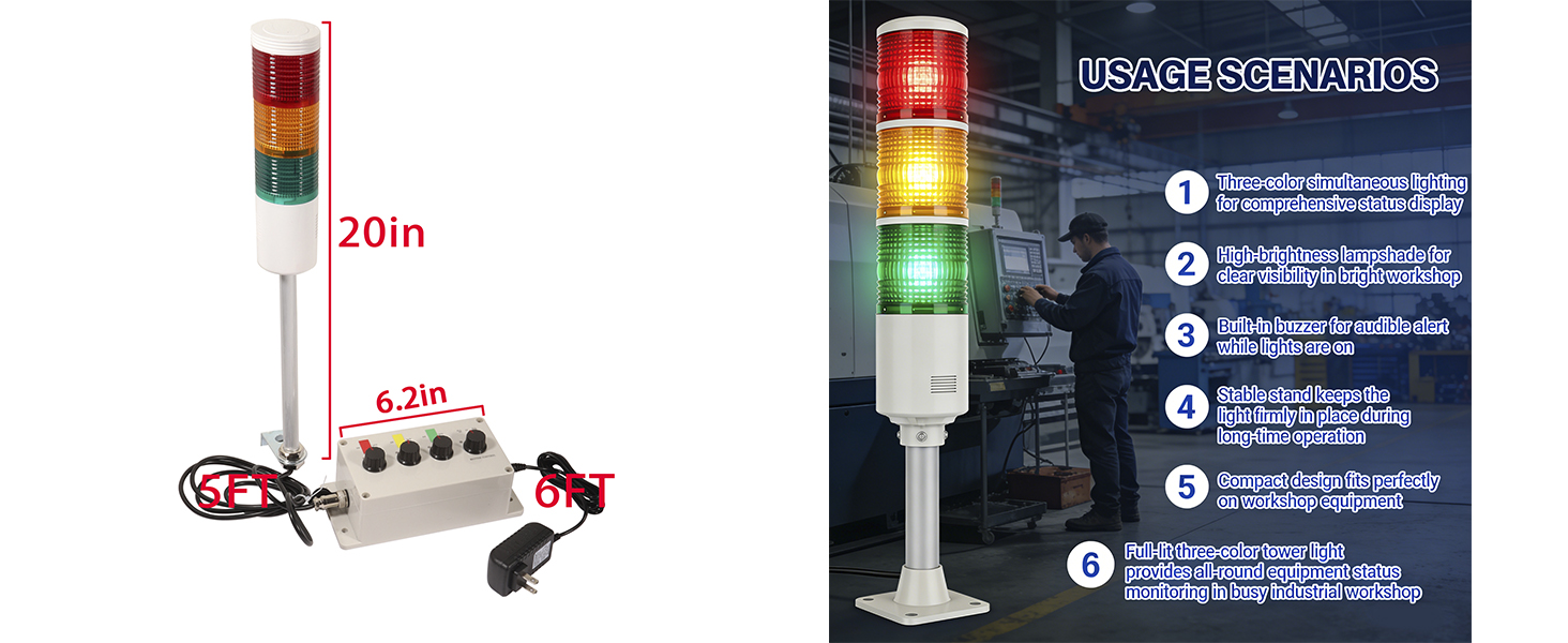 Super Bright LED & 360° Visibility: Features high-intensity LEDs with a multi-sided lens, ensuring clear visibility from all angles even in busy or bright industrial environments. Enables operators to quickly identify workflow status
