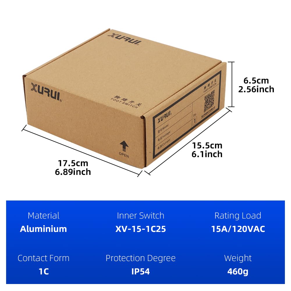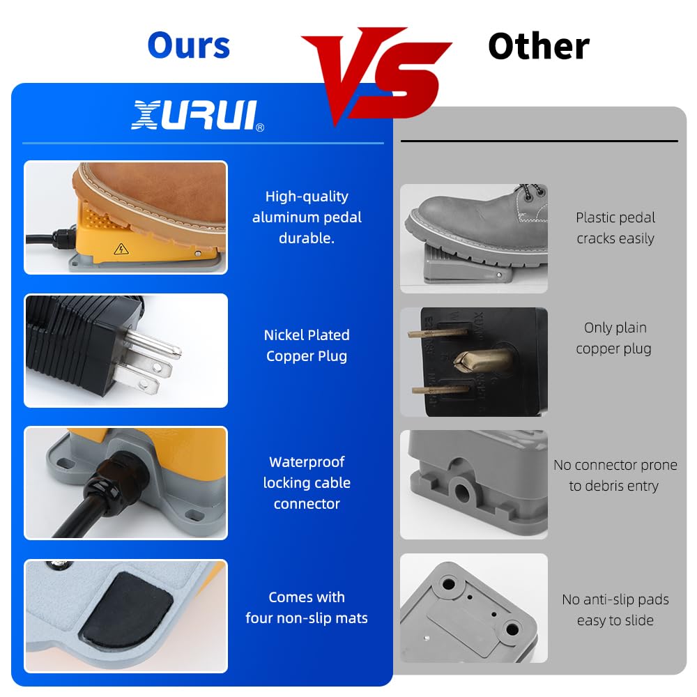 The XURUI UL Certified Foot Pedal Switch XF-4 is built for heavy-duty industrial applications requiring precise foot-based control. Made from premium aluminum, the pedal is strong and resistant to cracking, unlike plastic alternatives. It provides excellent durability even under constant pressure in demanding environments like woodworking shops, garages, and machine operations. This electric switch features a waterproof design and is connected via a high-quality 2m 18AWG extension cord. The 3-prong plug fits standard North American outlets, offering secure and stable power connectivity. The non-slip base ensures the foot switch remains firmly in place during use, preventing accidental slips. Perfect for powering tools, saws, or machinery, this foot-operated power control switch gives your hands freedom while maintaining full authority over your equipment.