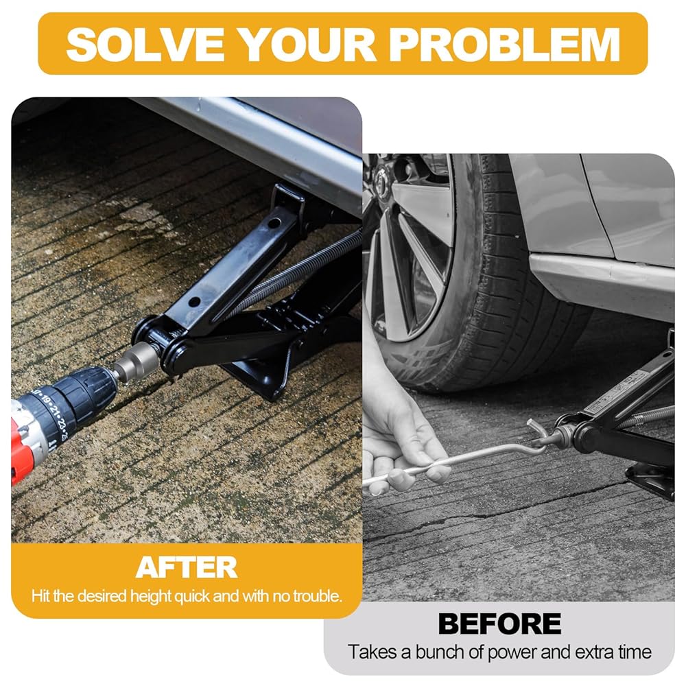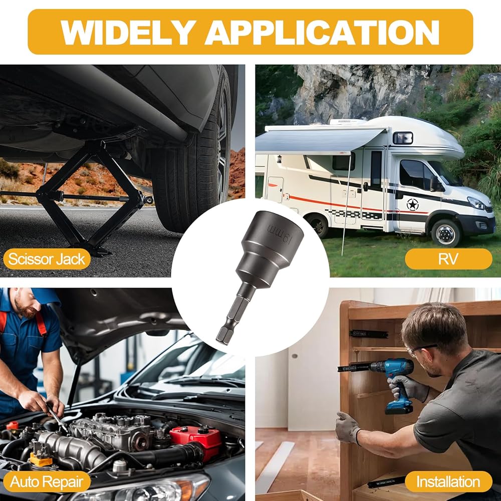【VERSATILE COMPATIBILITY】 The Drill Adapter is compatible with 1/4 inch quick connecting hex shank tools and 3/4 inch(19 mm) power drills, while the RV Scissor Jack Socket utilizes the drill's torque to quickly raise and lower jacks via trigger operation
