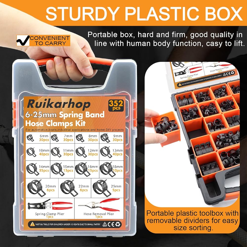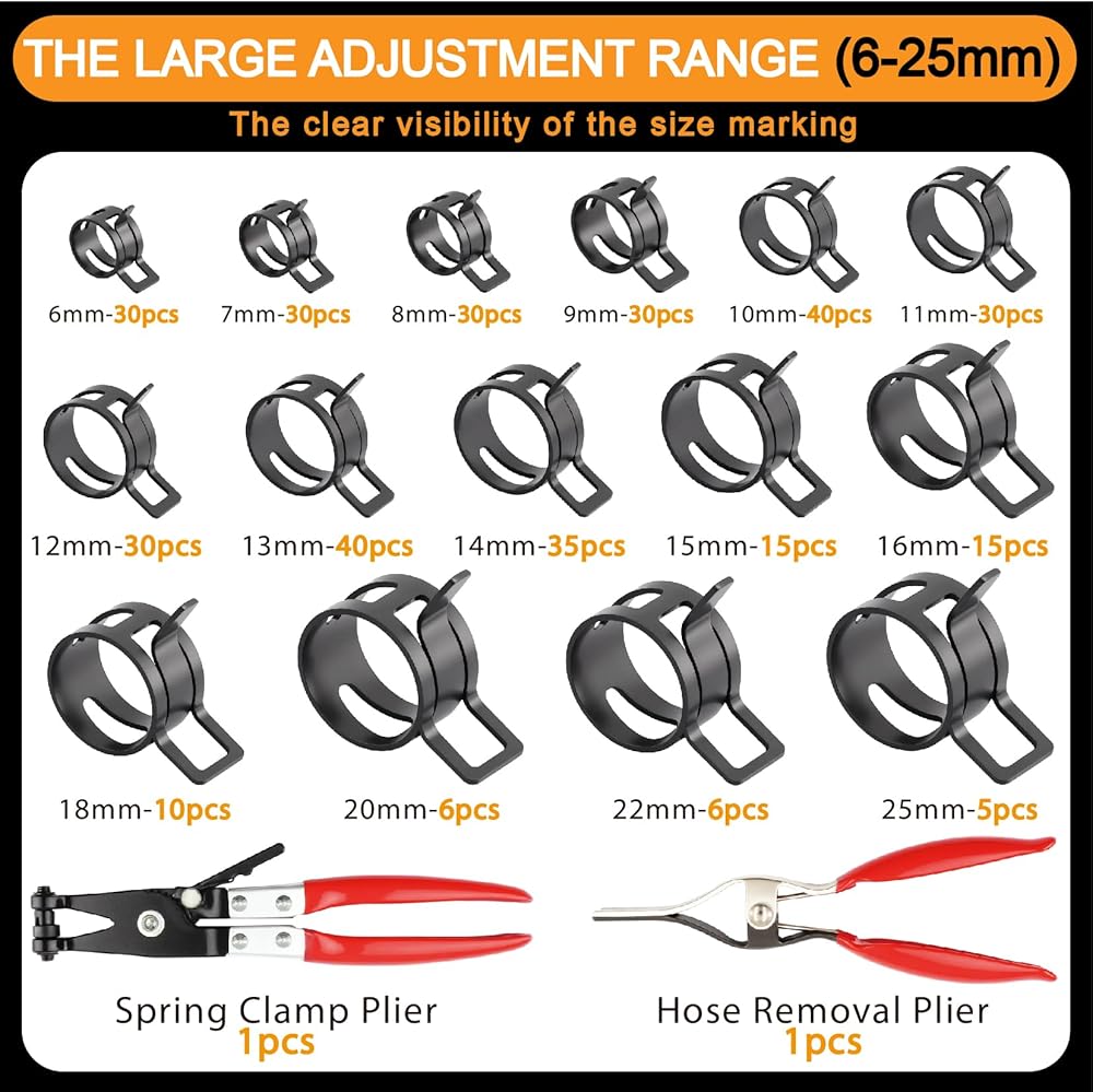 【Complete Kit】15 Sizes (6–25mm) – Includes 352 clamps covering the most common hose diameters for a perfect,secure fit in automotive,marine,and home applications.