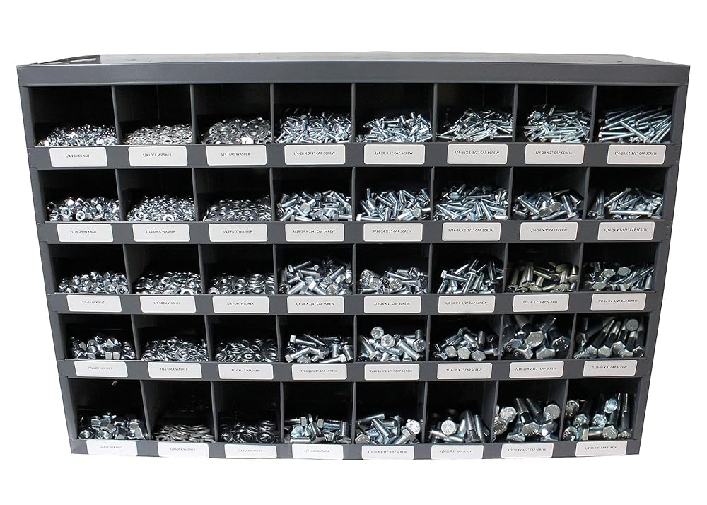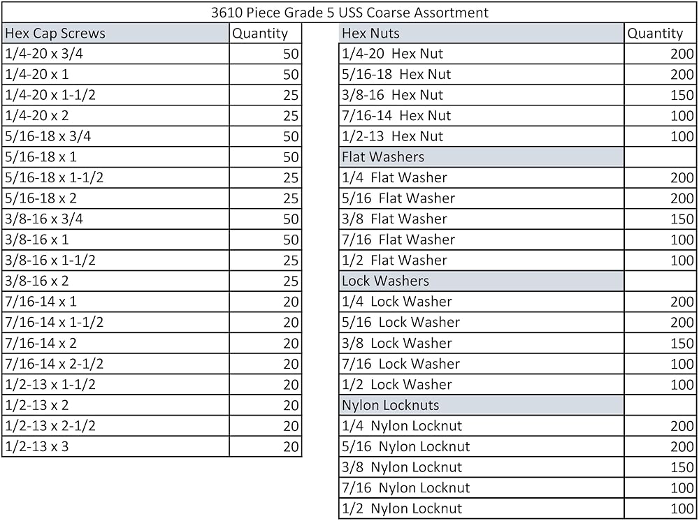 unlike other fastener assortments on amazon, our kit includes 1/4-20 through 5/8-11! we skip the very uncommon 7/16-14 included in the other assortments. includes uss flat washers, lock washers, hex nuts, and hex head cap screws. all fasteners clear zinc plated with grade-5 hex head cap screws