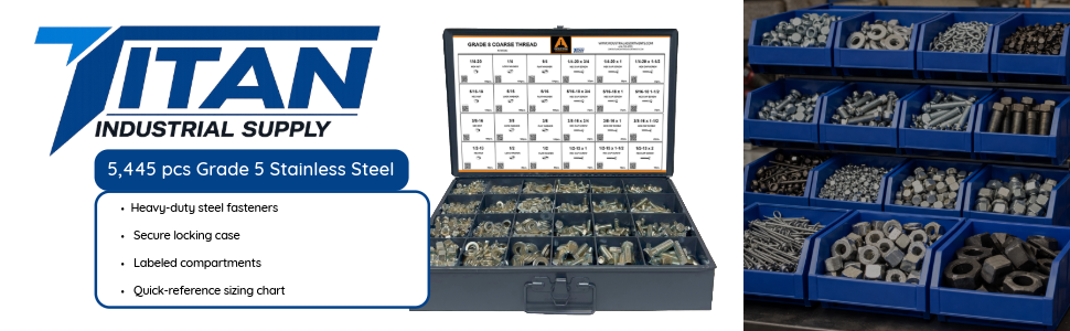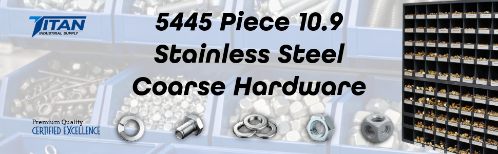 Titan Industrial Supply- 5,445 pcs Stainless Steel Coarse Hardware Assortment Kit with Hex Cap Screws, Hex Nuts, Nylon Locknuts, Washers, & Two Durham 40 Hole Metal Bins