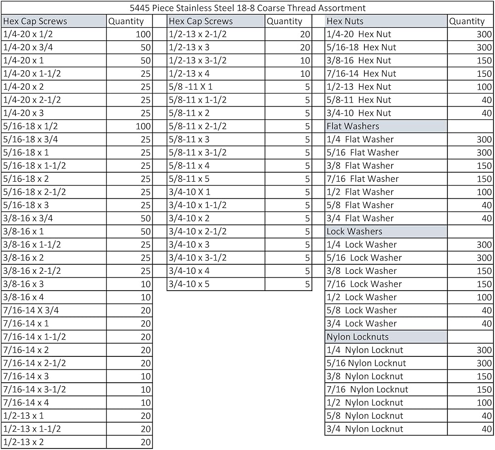 - More Sizes and Pieces: 5,445 pieces. Hex Cap Screws- Hex Nuts, Nylon Locknuts, Flat Washers & Lock Washers