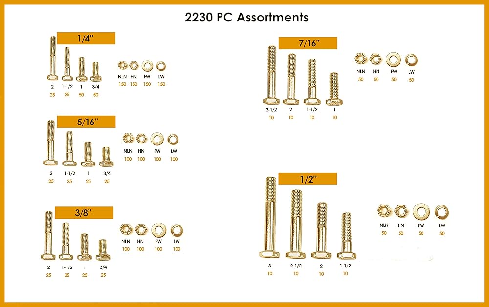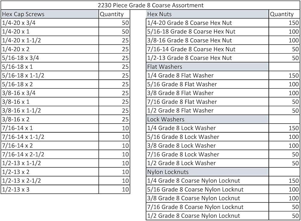 Titan Industrial Supply- 2,230 pcs Grade 8 Coarse Hardware Assortment Kit with Hex Cap Screws, Hex Nuts, Nylon Locknuts, Washers, & Durham 40 Hole Metal Bin