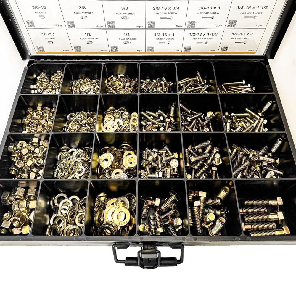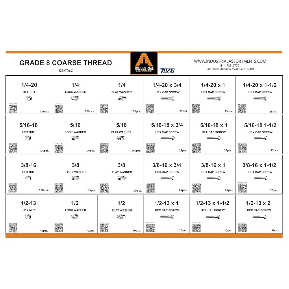Titan Industrial Supply- 1,275 pcs Grade 8 Coarse Hardware Drawer Assortment with Hex Cap Screws, Hex Nuts, Washers. Nicely organized by size in a Heavy Duty Durham 24 Compartment Metal Drawer.