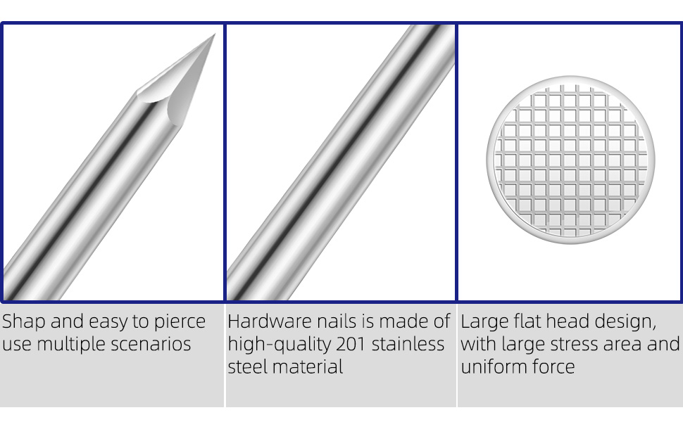 Feature: Large flat head design, with large stress area and uniform force. Hardware nails are of hard material, very strong and sharp, and keep the shape and not bend easily when you use.