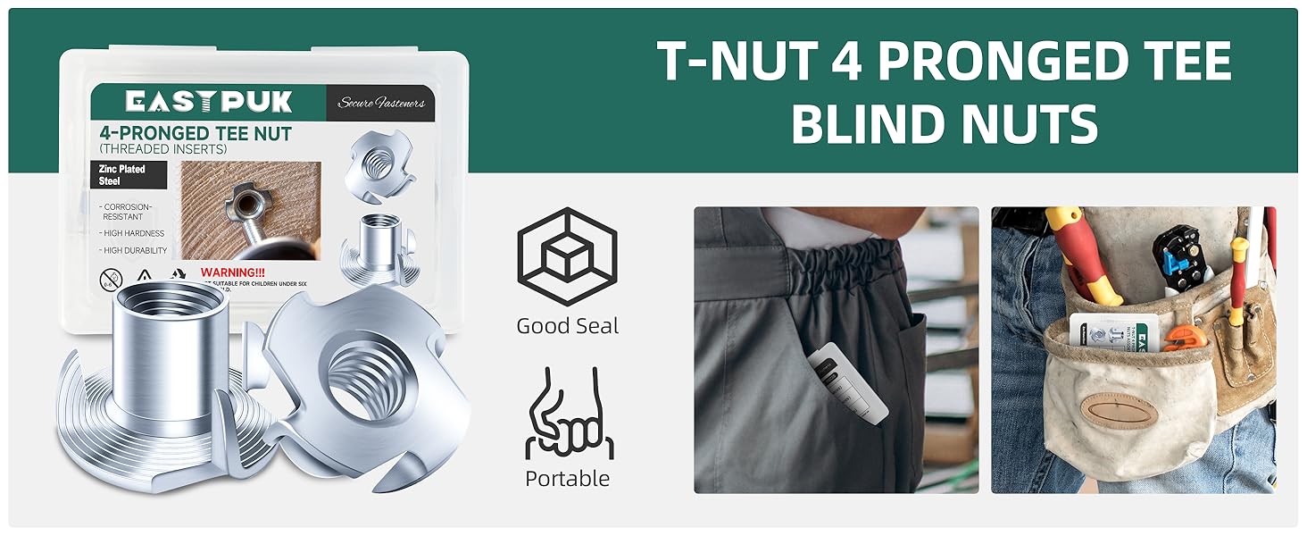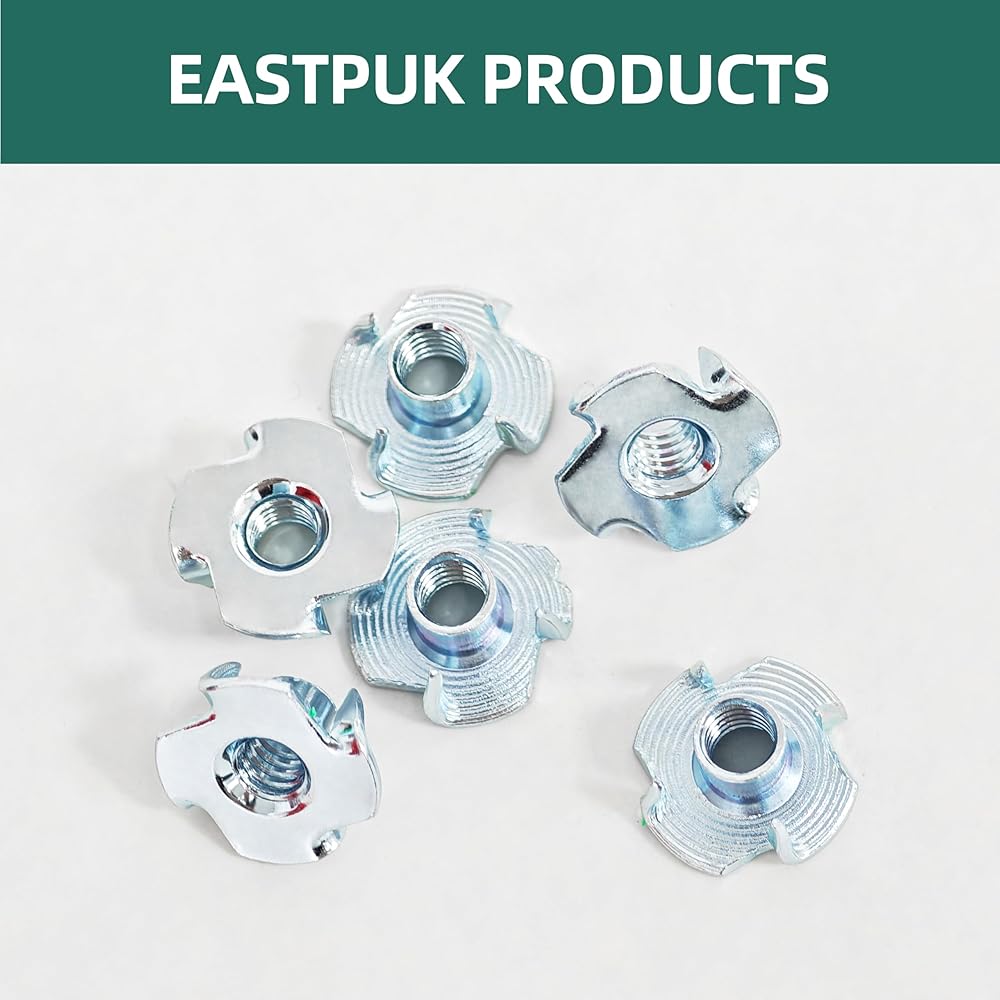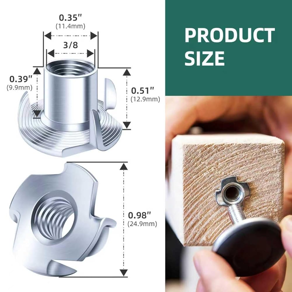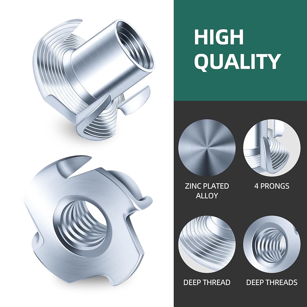 Material - The 3/8 T Nuts are constructed from zinc-plated alloy steel, providing a durable protective layer that resists peeling and helps prevent rust. The coating of T-nuts enhances longevity in indoor woodworking applications.