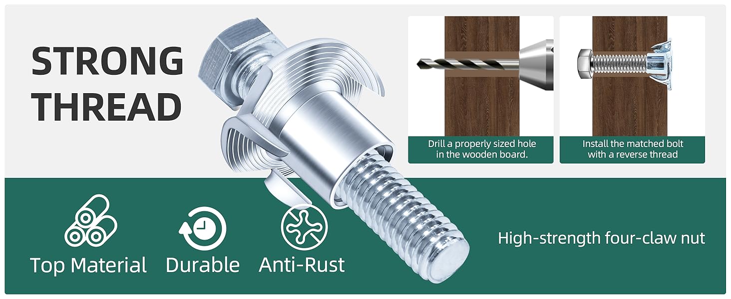 Simple Installation - Attach to a mating screws bolts and rotate counterclockwise into wood; the four claws of nuts gradually embed into the material without requiring hammering or additional tools.