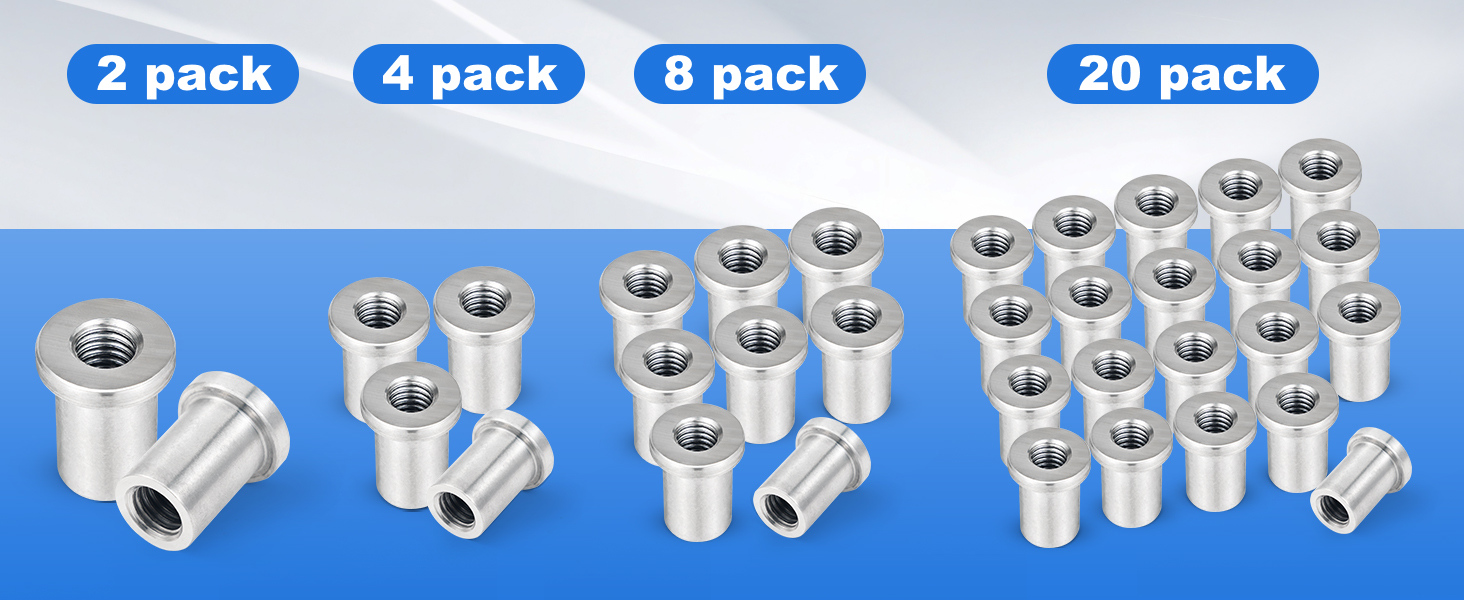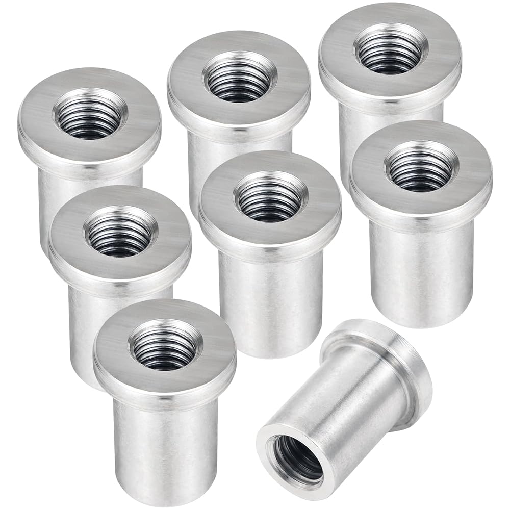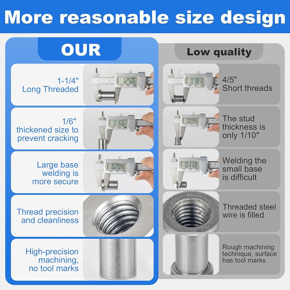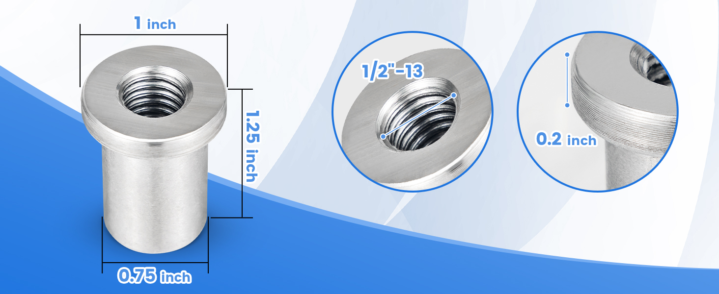 🔩【Precise Dimensions & Specifications - For Deep Thread Engagement】 This pack includes eight 1/2"-13 standard thread weld nuts. Featuring a large outer diameter (OD) of 1 inch, a small OD of 3/5 inches, and a unique extended sleeve design with a total length of 1-1/4 inches, these weld nuts provide significantly deeper thread engagement compared to standard weld nuts. This design enhances tensile strength and vibration resistance at the connection point, ensuring reliability under heavy-load conditions.