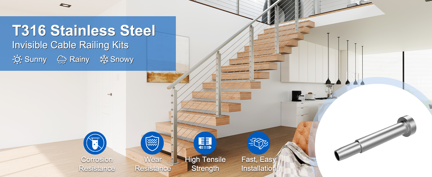 【APPLICATIONS】It is suitable for 2"x2", 4"x4" wood /metal Posts, level & angle installation. Invisible cable railing kits work by securing one end of a cable wire within the post. This way, no fasteners are visible to the exterior eye. When using invisible cable railing system on a stairway or other angle application, we recommend using 3/8 ID 30 degree angle washer: B0BXD53X9P.