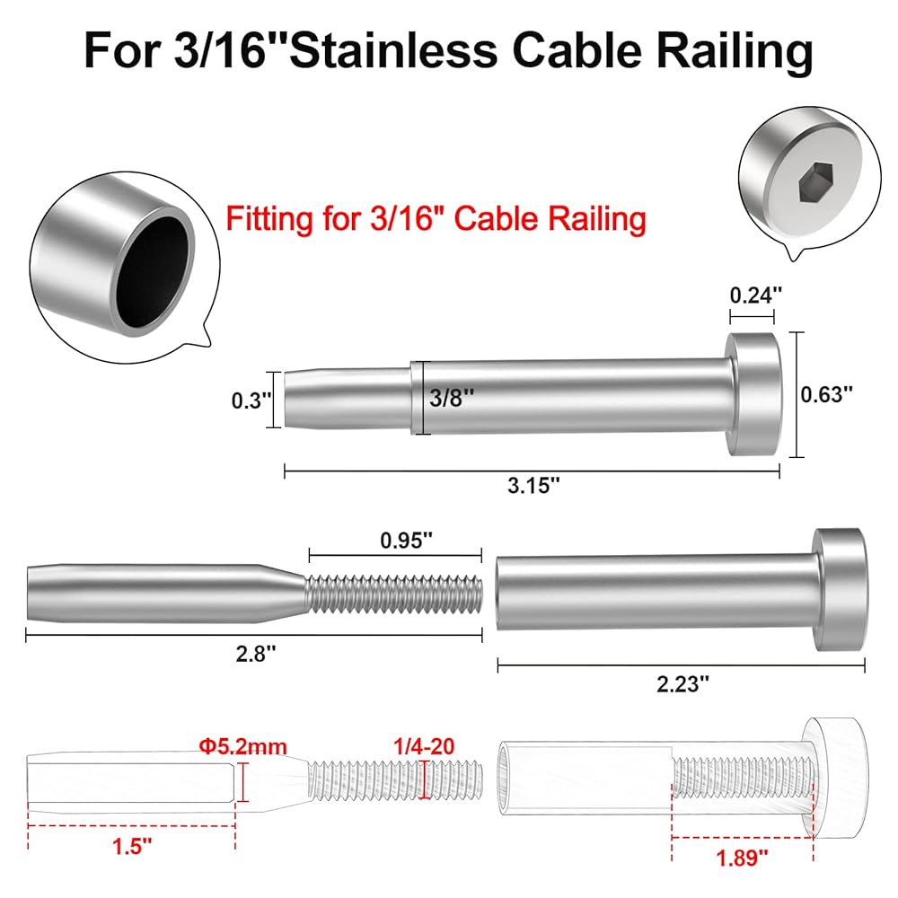 BLIKA 20 Pack Stainless Steel Invisible Receiver and Swage Stud End for 3/16 Inch Cable Railing, Deck Stair Threaded End Fitting for 2"x2", 4"x4" Wood/Metal Posts, 3/16" Cable Railing Hardware