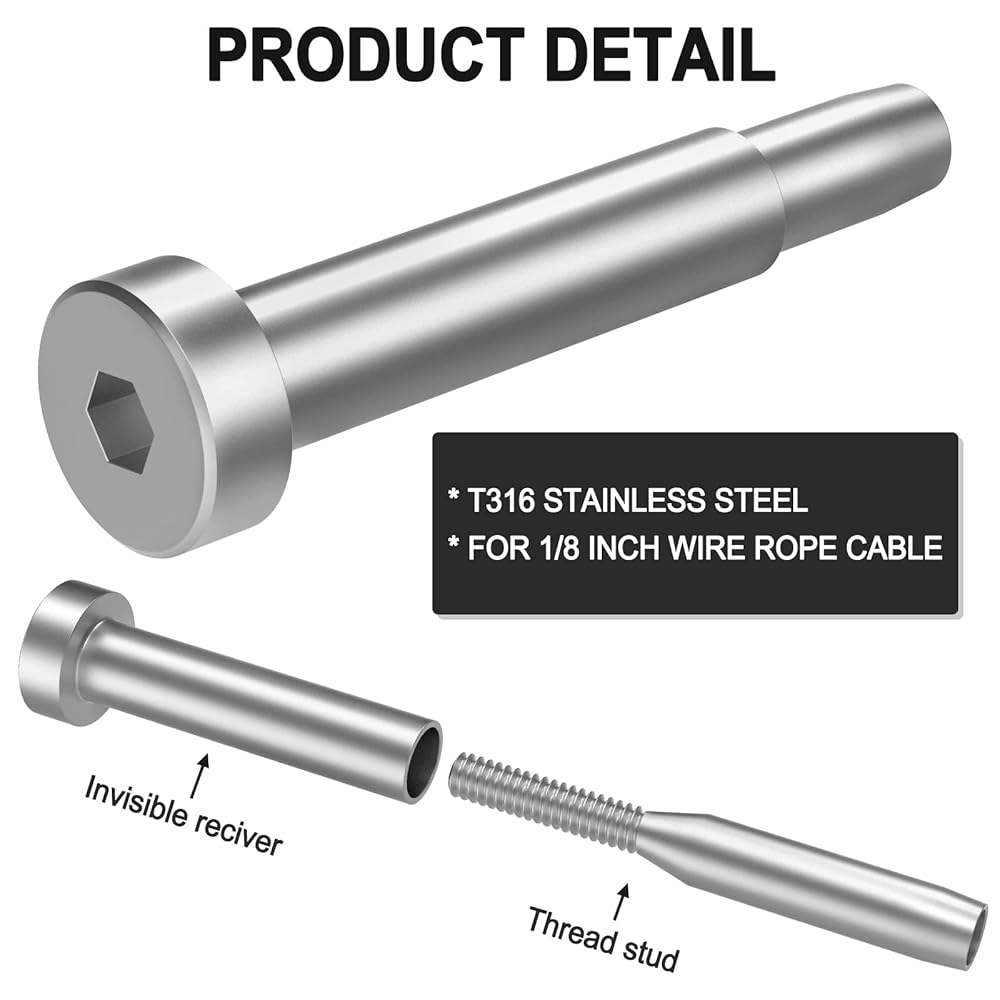 【PACKAGE LIST】20 Pack T316 Stainless Steel Invisible Receiver and Swage Stud End. If you're not satisfied with this item at any time within one month of purchase, we'll provide a refund or replacement.