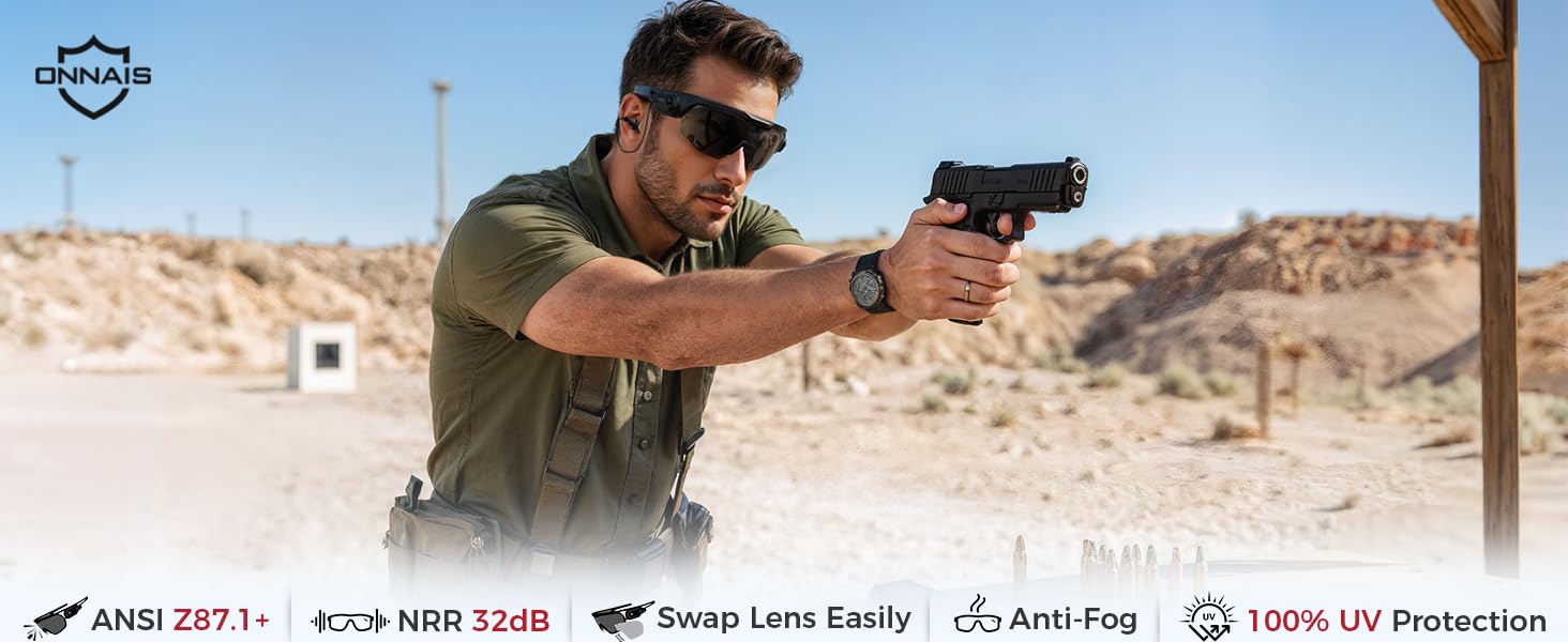 ONNAIS Shooting Glasses with Earplugs - ANSI Z87.1+ Safety Glasses with Detachable NRR 32dB Earplugs, Gifts for Men and Women