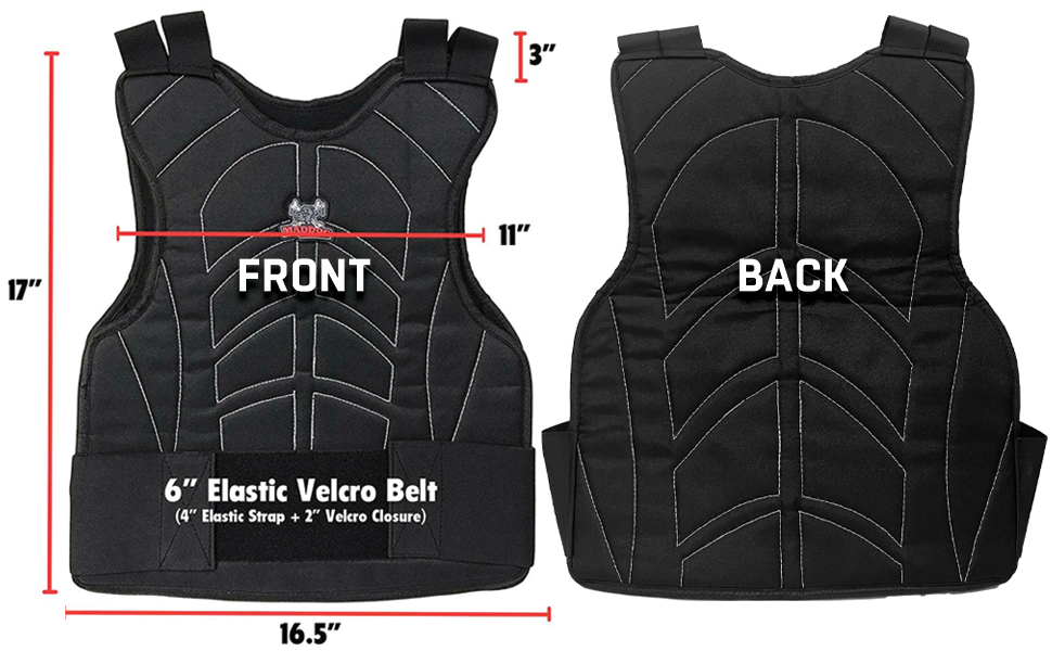 Take the PAIN Out of Paintball, Airsoft, Etc.! Perfect for all your action sports! Maddog's padded chest protector vest helps soften the blow of a direct hit! Comfortable, functional chest and back protection built for paintballers, airsofters, action sports, etc. Adjustable One-Size Fits Most Design for Youth, Teens, Up to Adult Medium - Check the sizing chart for expected coverage.