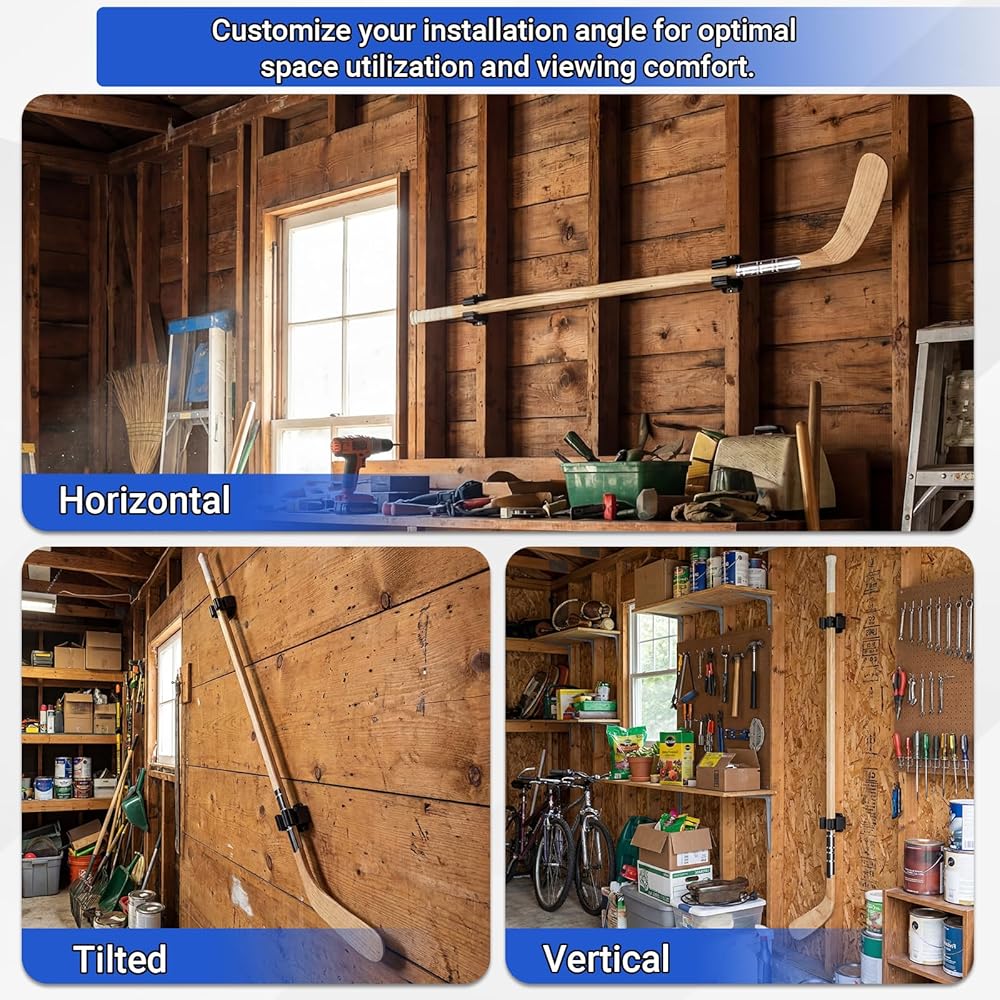 Multi-Angle Installation: our hockey stick storage accommodates horizontal, vertical, or diagonal installations; Whether you're displaying hockey sticks, badminton rackets, or other sports equipment, this flexible mount adapts to any setup, ensuring your gear is both accessible and beautifully staged