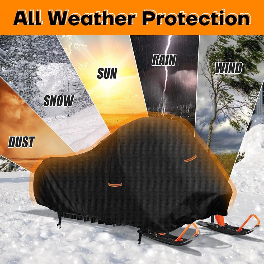 Heavy-duty Waterproof:Made of heavy-duty polyester fabric with waterproof PU coating & anti-UV coating; It has excellent waterproof performance, helps to prevent moisture from infiltrating seams; This will protect your snowmobile from dust, and dirt, and dampness, and other unwanted substances