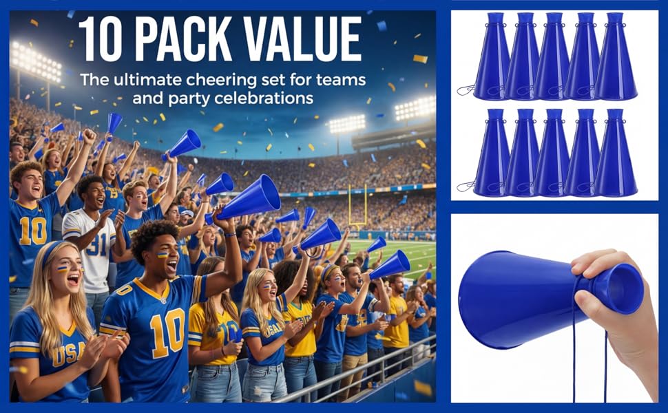 Portable Multi-Pack Value: The package comes with 10 cheer megaphones, enough for your sharing and replacement needs. Each trumpet measures 5"D x 9"H, easy to carry anywhere for spontaneous cheering. Suitable for 14 years old and above