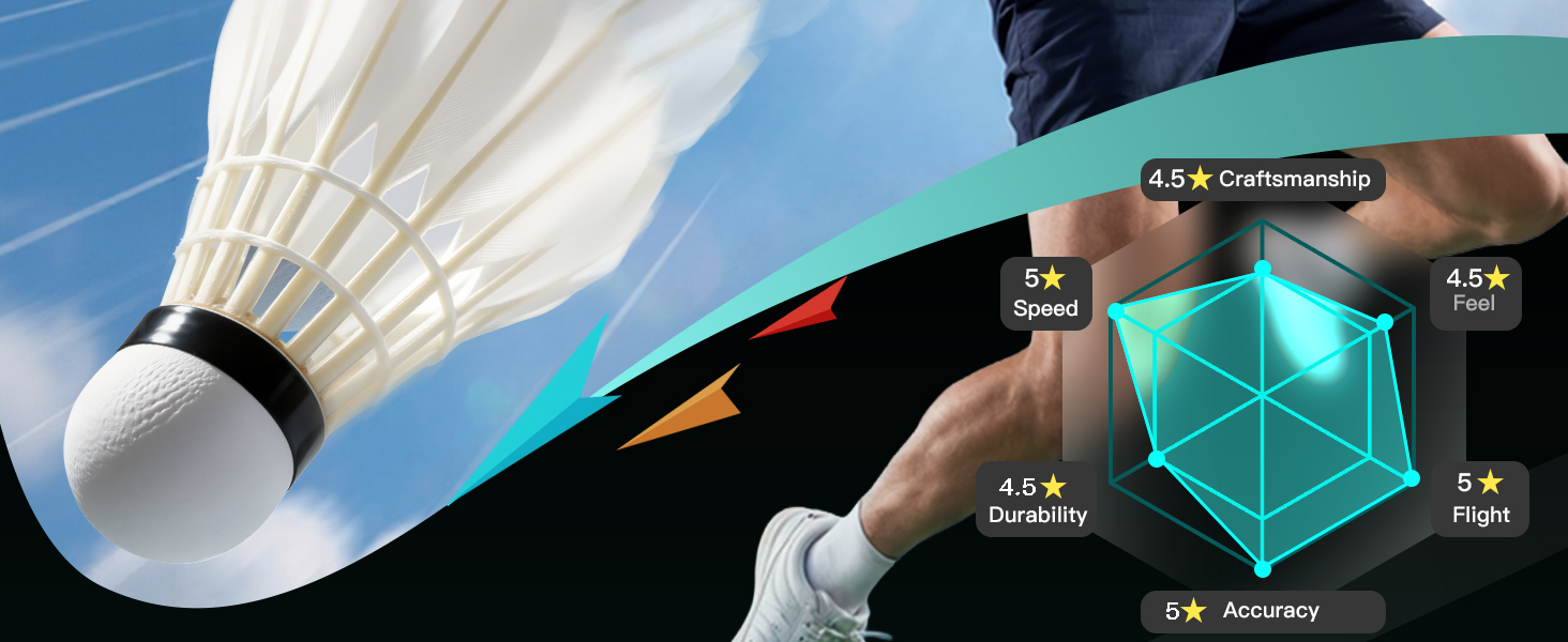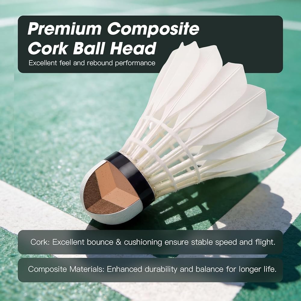Composite Cork Head: Each feather badminton birdies fitted with a solid composite cork head that offers a satisfying impact feel and steady bounce. The sturdy base helps absorb the shock of your swings, providing a comfortable playing experience during extended practice without easily losing its shape.