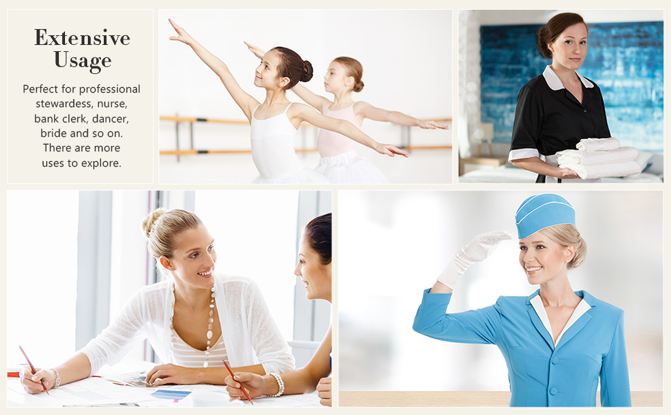 Quality hair nets: nylon elastic lace with hand-tying, light weight, strong, durable; Great for stewardess, nurse, bank clerk, hotel clerk, dancers or skaters and so on, which make their hair will stay in place while performing