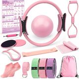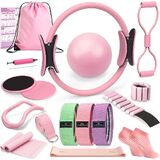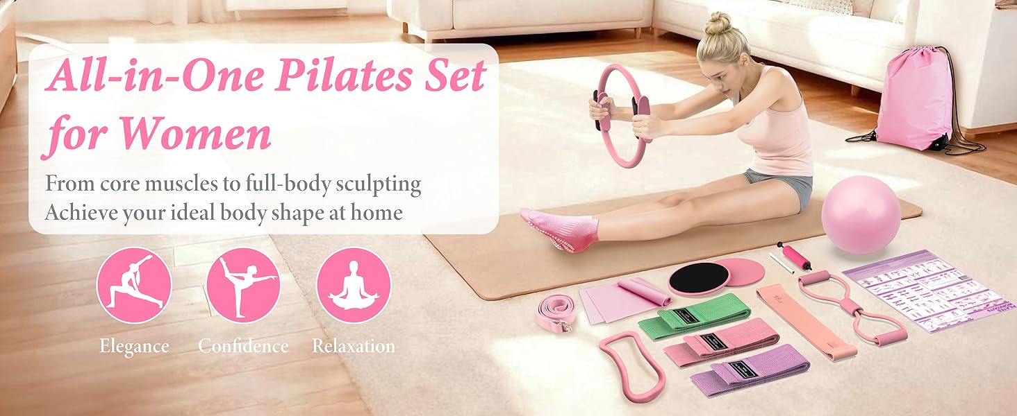 Full Pilates Kit for Women: Home pilates kit includes 14.6" Pilates ring x1, 8.7" Pilates ball with pump and tube x1, resistance bands x4, long resistance band x1, core sliders x2, pilates socks x1, yoga stretch band x1, stretch rings x1, figure 8 resistance band x1, storage bag x1, workout guide x1. A full-body at home pilates kit for strength, toning, and flexibility