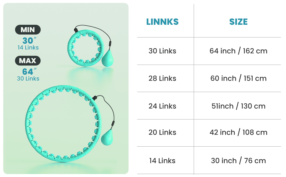 The infinity Fitness hoop includes 26 detachable links which will suit all size between 30 inches (14 links) and 64 inches (30 links), you can assembly the number of links fit your size