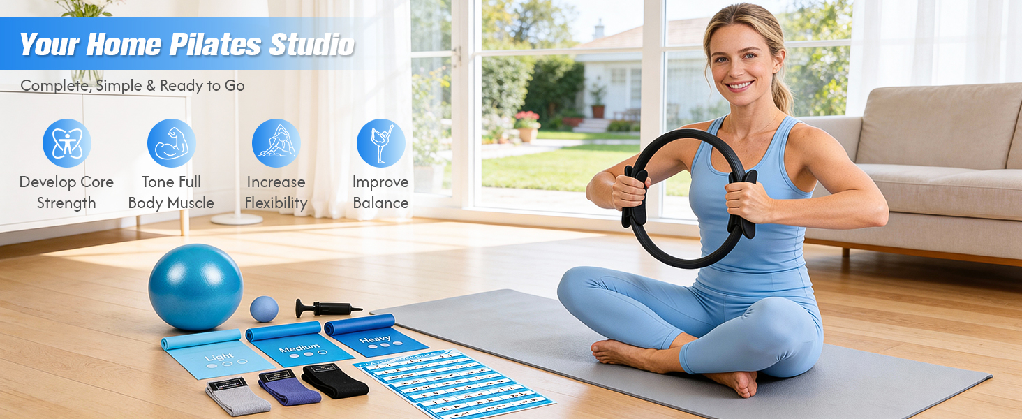 Beginner-Friendly & Full Body Workouts Pilates Equipment - The pilates set includes dedicated exercise guides for each accessory, making it simple for starter to learn and use them with confidence. The Pilates ring tones arms and inner thighs, the pilates ball strengthens your core and balance, the long resistance bands sculpt shoulders, back, and legs, and the loop bands lift glutes and shape thighs. Start your total-body transformation with confidence. This home pilates kit makes it easy