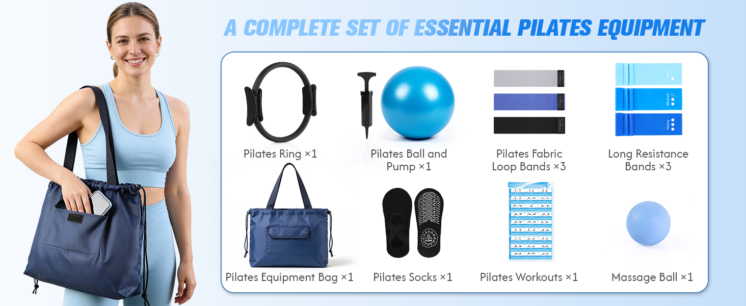 All-in-one at Home Pilates Kit - This all-in-one Pilates equipment kit Includes everything you need to start your pilates workout journey: a pilates ring, pilates ball, pump, 3 long resistance bands+ 3 fabric Pilates Loop Bands , non-slip pilates socks, massage ball, large tote bag, and detailed workout guide. Complete pilates equipment covering a wide range of exercises for strength, flexibility, and balance