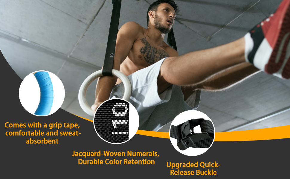 QUICK-ADJUST NUMBERED STRAPS: 38mm straps with woven numbers support quick, precise length settings. Clear markings promote balanced exercise positions and fast setup in various locations. This allows smooth transitions between movements for indoor or outdoor training