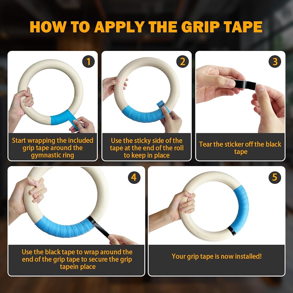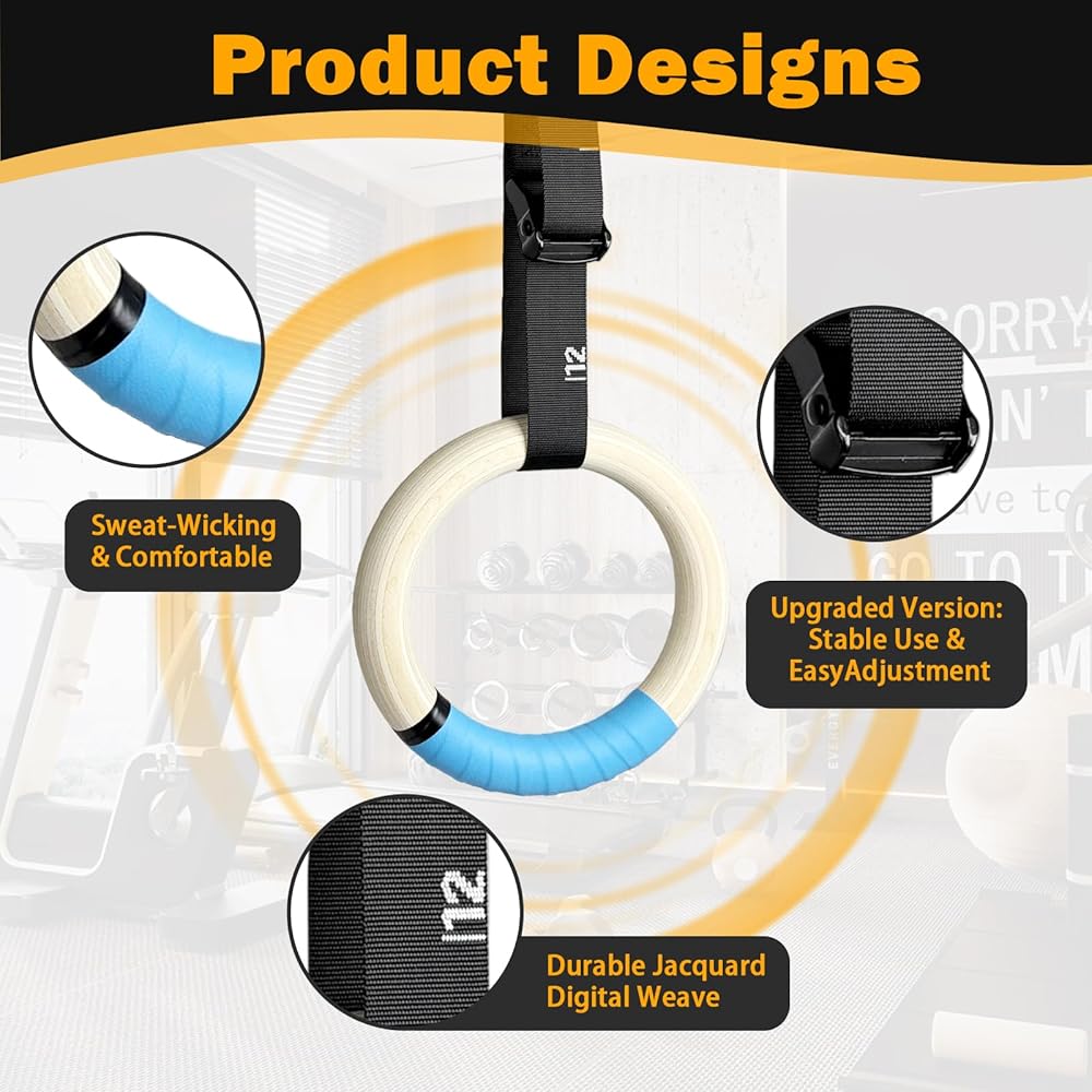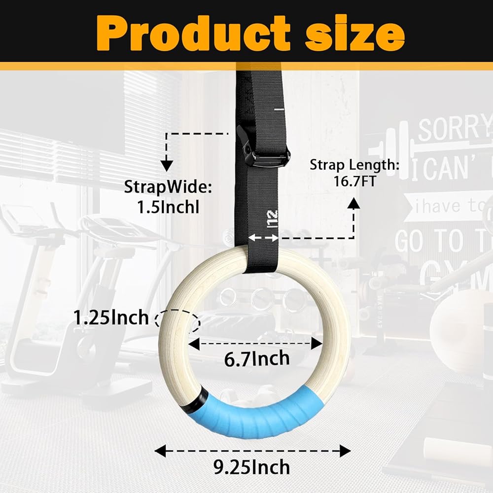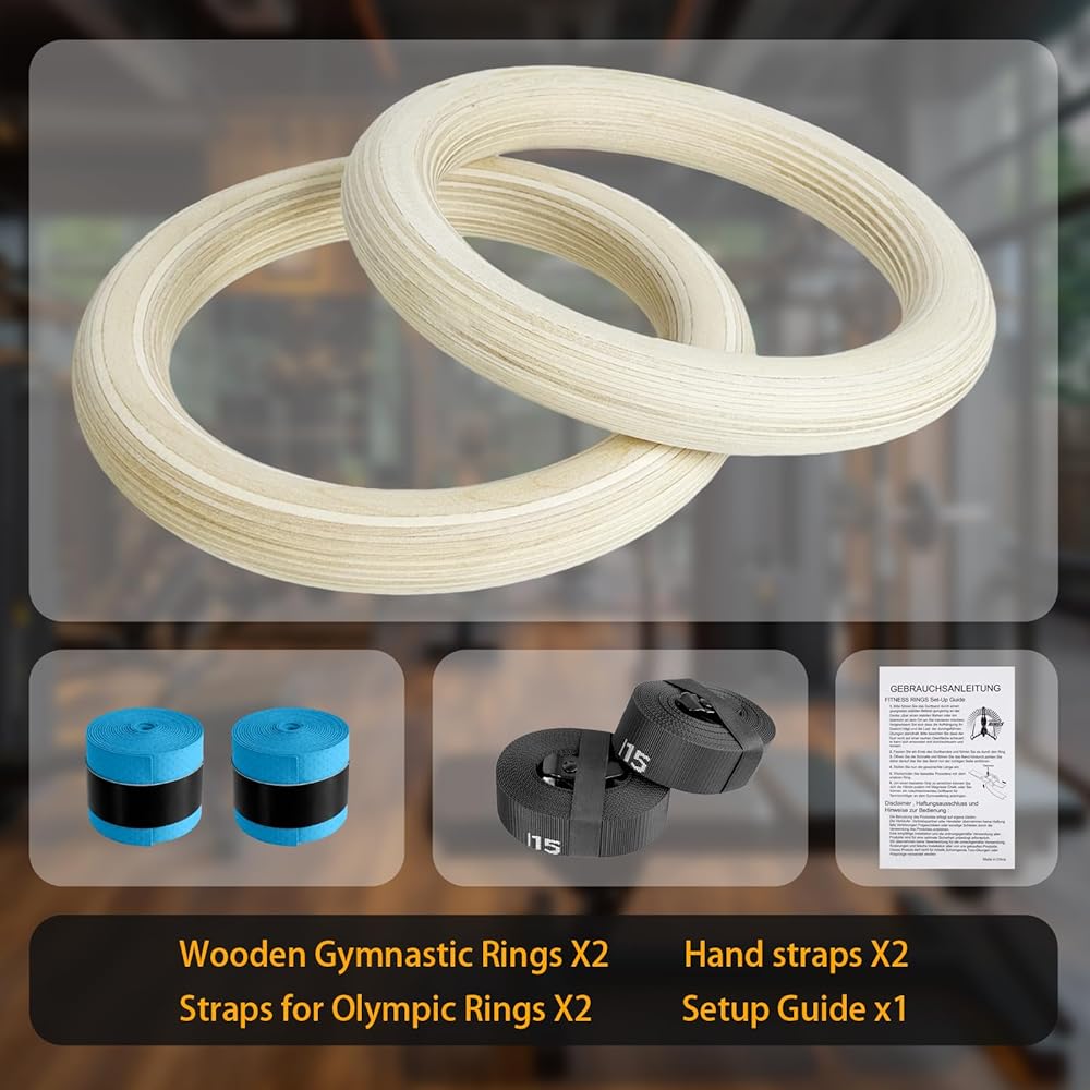 COMPLETE READY-TO-USE SET This set contains two birch wood rings, two 5.1m adjustable straps, and two sweat-absorbing hand wraps. The extended straps support setup in various locations including garages, under park trees, or elevated spaces