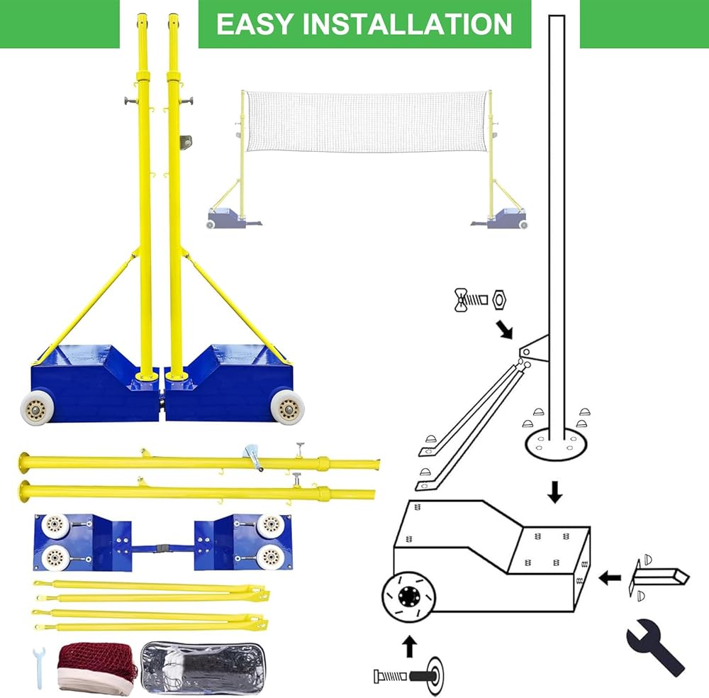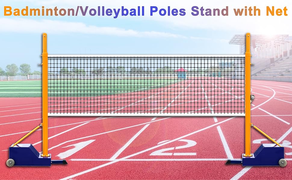 【Unique Design】The mobile badminton net stand is equipped with pulley and a crank-type tightener, it is easy to set up the badminton net and volleyball net. Integrated wheels allow effortless move across courts, beaches, or lawns while maintaining structural integrity during transport