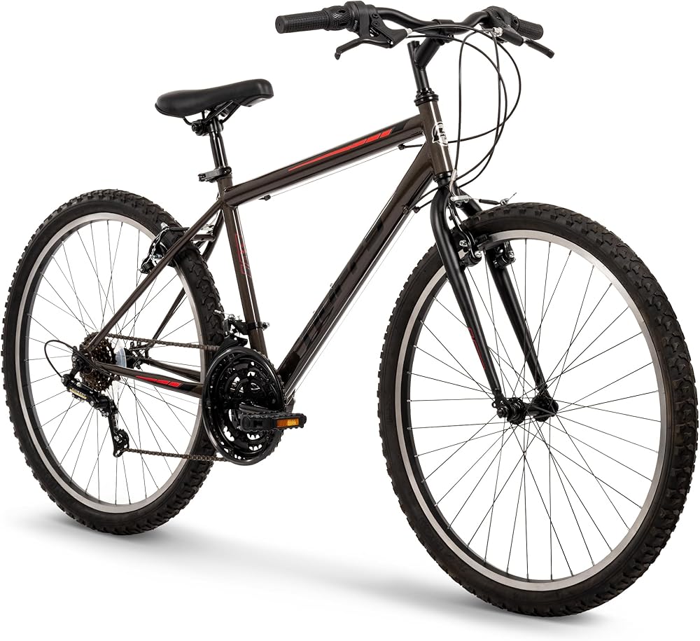 Take on any adventure with the Huffy North Peak 26-Inch Men's Mountain Bike, built for strength, control, and comfort. Featuring a durable steel frame with a sleek Warm Charcoal gloss finish, this men's bicycle is designed to handle rugged trails and smooth streets alike. The 15-speed twist shifter ensures effortless gear changes, making it easy to navigate various terrains with confidence. Reliable front and rear linear-pull brakes provide responsive stopping power, enhancing control and safety on every ride. Equipped with 26-inch all-terrain tires and sturdy alloy rims, this adult mountain bike delivers excellent traction and stability on dirt paths, gravel trails, and paved roads. A slightly raised handlebar, padded ATB saddle, and quick-release seat post allow for a comfortable, customized fit, ensuring a smooth ride no matter the distance. Whether you're exploring new trails or cruising through the neighborhood, the Huffy North Peak offers performance, durability, and all-day riding comfort.
