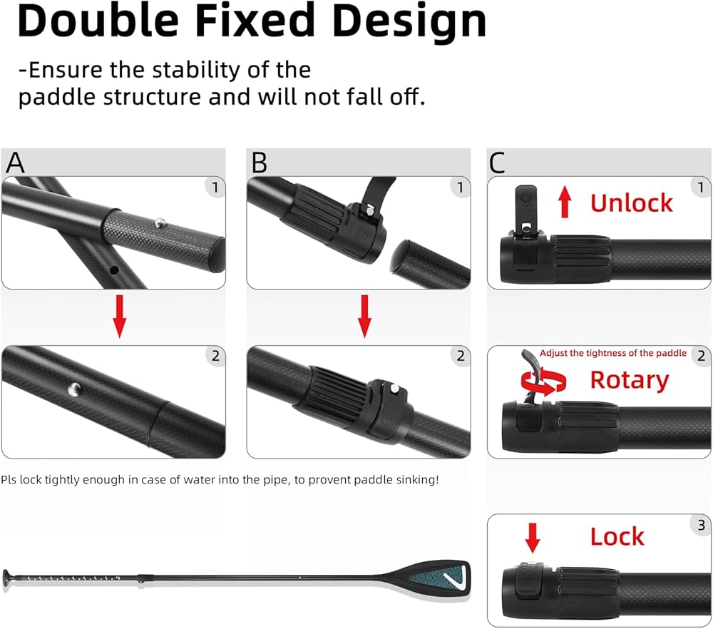 Anti-Twist Clamp Design: Featuring a 360-degree rotating anti-twist clamp, our paddle allows for quick adjustments, locking, and assembly. The quick-release button lock design makes it easy to assemble and disassemble the paddle shaft. The ergonomically designed T-grip handle enhances grip and comfort, reducing hand fatigue. Important: Before use, check and tighten the screws on the clamp to prevent twisting and water ingress, ensuring buoyancy.