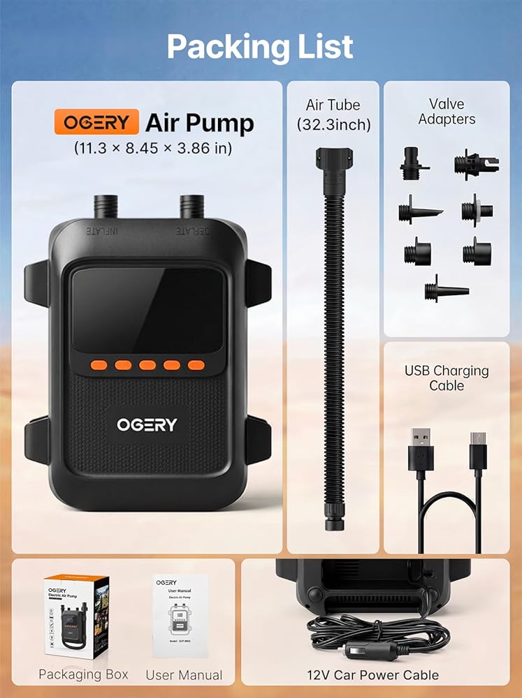 OGERY Paddle Board Electric Pump with Safe & 30% Faster Dual Stage Inflation & Deflation, Up to 20PSI, Smart Auto-Off and Powerful Rechargeable Compact Air Pump for Sup Inflatable Beds Tent Boats