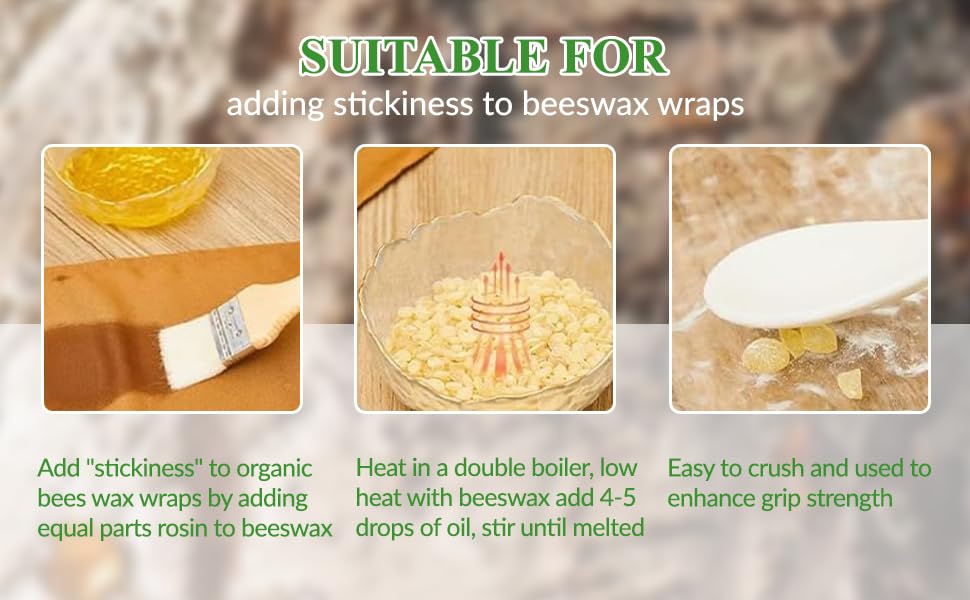 • THE ULTIMATE SECRET FOR DIY BEESWAX FOOD WRAPS – Create professional-quality, reusable food storage wraps at home. This high-tack pine gum rosin is the essential ingredient to make beeswax stick to fabric. Simply melt with beeswax pellets and jojoba oil for an eco-friendly, plastic-free alternative to cling wrap that actually stays sealed.
