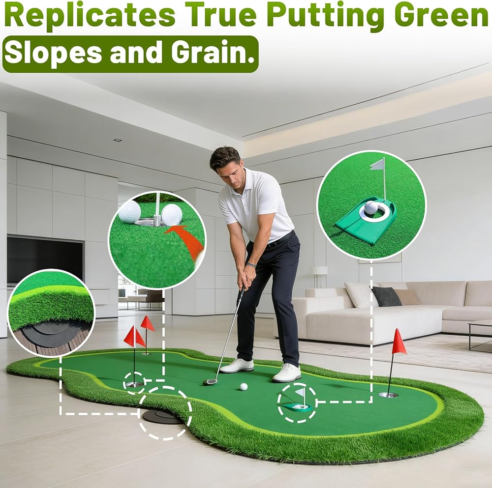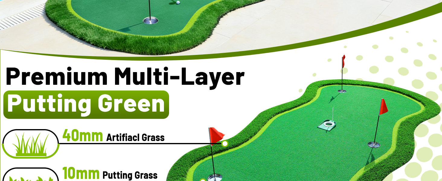 Durable & Versatile----Our golf putting green is designed to perform in a variety of environments. Whether you're practicing indoors at home, in the office, in the garage, in your backyard, or even outdoors, this golf putting mat adapts to all spaces with ease. Made with a durable, wear-resistant surface, it delivers consistent performance even with regular use. Cleaning is a breeze—simply vacuum or rinse with water. If the golf training mat gets wet, allow it to air dry in the sun