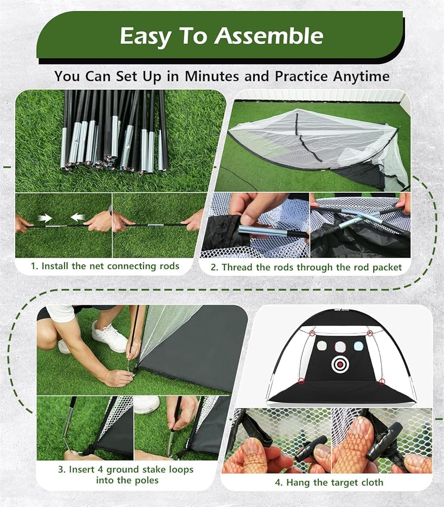 【🏌Easy to Install and Disassemble】Our golf net is easy to set up and take down within 5 minutes. It comes with clear instructions and all necessary components, making the assembly process quick and hassle-free. A small carry bag is filled with all the accessories, saving space and easy to carry. You can set a golf net up easily anywhere, indoor or outside, in the living room, backyard, or basement. The convenience and versatility of our set make it the perfect choice for golf enthusiasts.