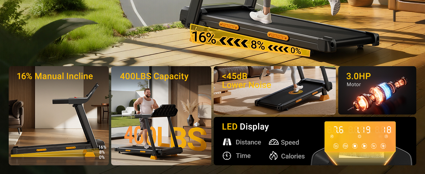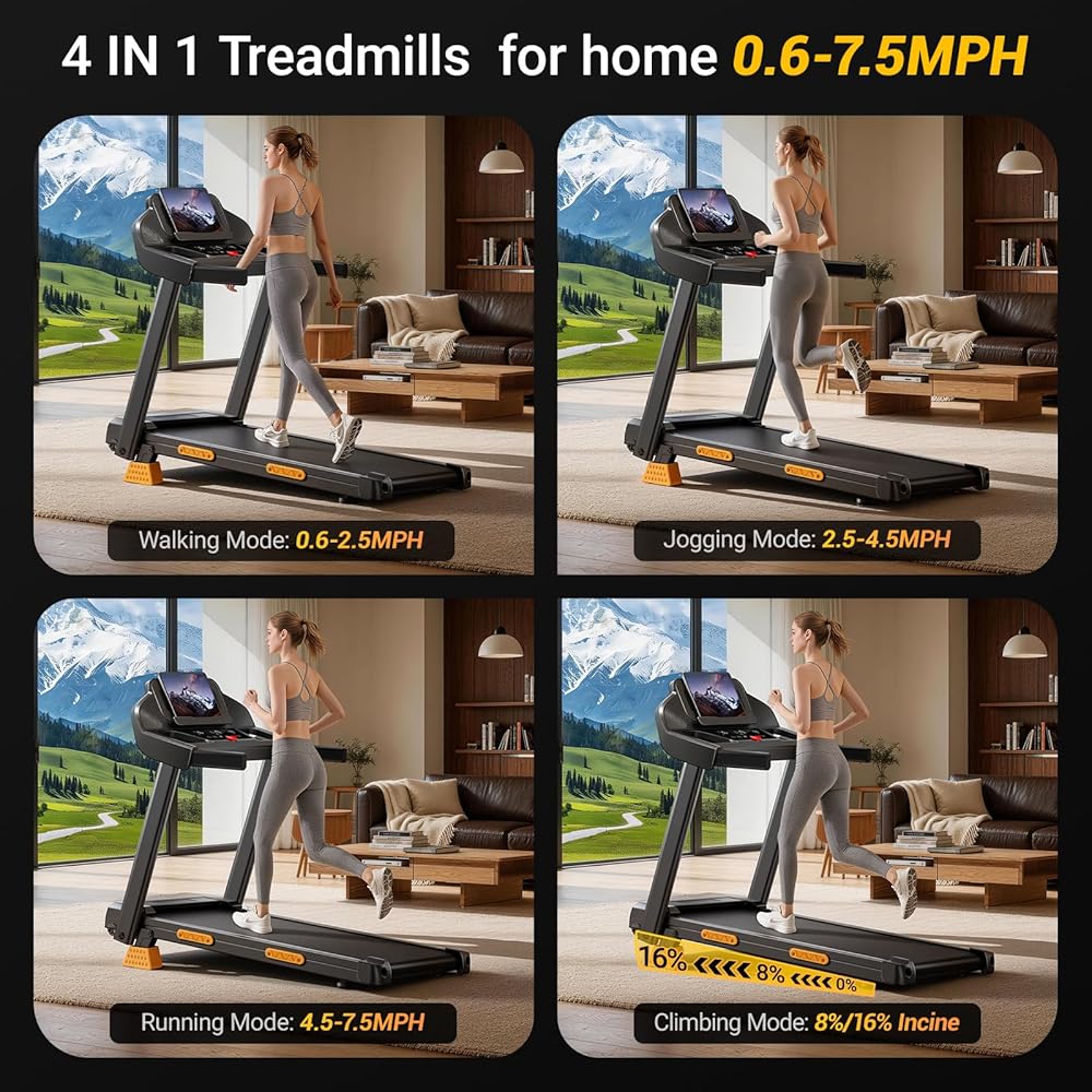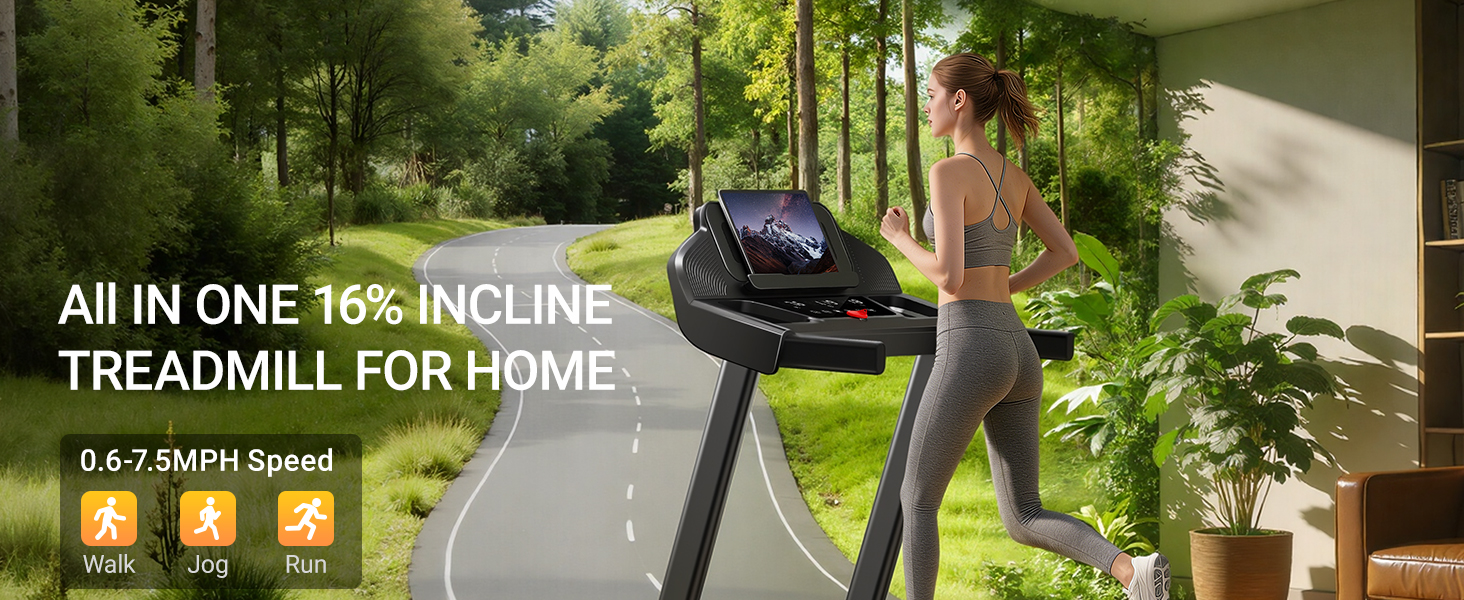16% Incline & Adjustable Speed for Effective Training: Maximize your workout efficiency with a steep, gym-grade 16% incline on this treadmill with incline. It perfectly simulates challenging outdoor terrain, dramatically boosting calorie burn and building endurance from the comfort of your home or office, all within a 0.6-7.5 MPH speed range