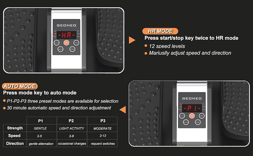 【Auto and manual dual modes】 The elliptical leg machine has (HR) manual (support 12 speed adjustment) and automatic (P1-P2-P3 three preset modes) two modes for you to choose. Adjust the speed to achieve the workout you need, while the pedal rotation direction can be forward or backward to target different muscle groups