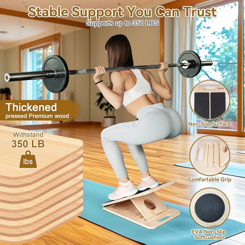 This Ogurey Slant Board for Calf Stretching features a thickened pressed wood frame (supports up to 350 lbs) for unshakable stability, paired with 2 pieces of 12.4in×5.51in PVC non-slip sandpaper footrests and an EVA anti-slip base to prevent sliding. With 5 adjustable angles (20°, 30°, 35°, 40°, 45°) and a spacious footrest that fits all foot sizes, it adapts to beginners, fitness enthusiasts, and those in therapeutic recovery alike. Foldable design makes it easy to store and carry for use at home, gym, office, physiotherapy room, workout studio, or outdoors.